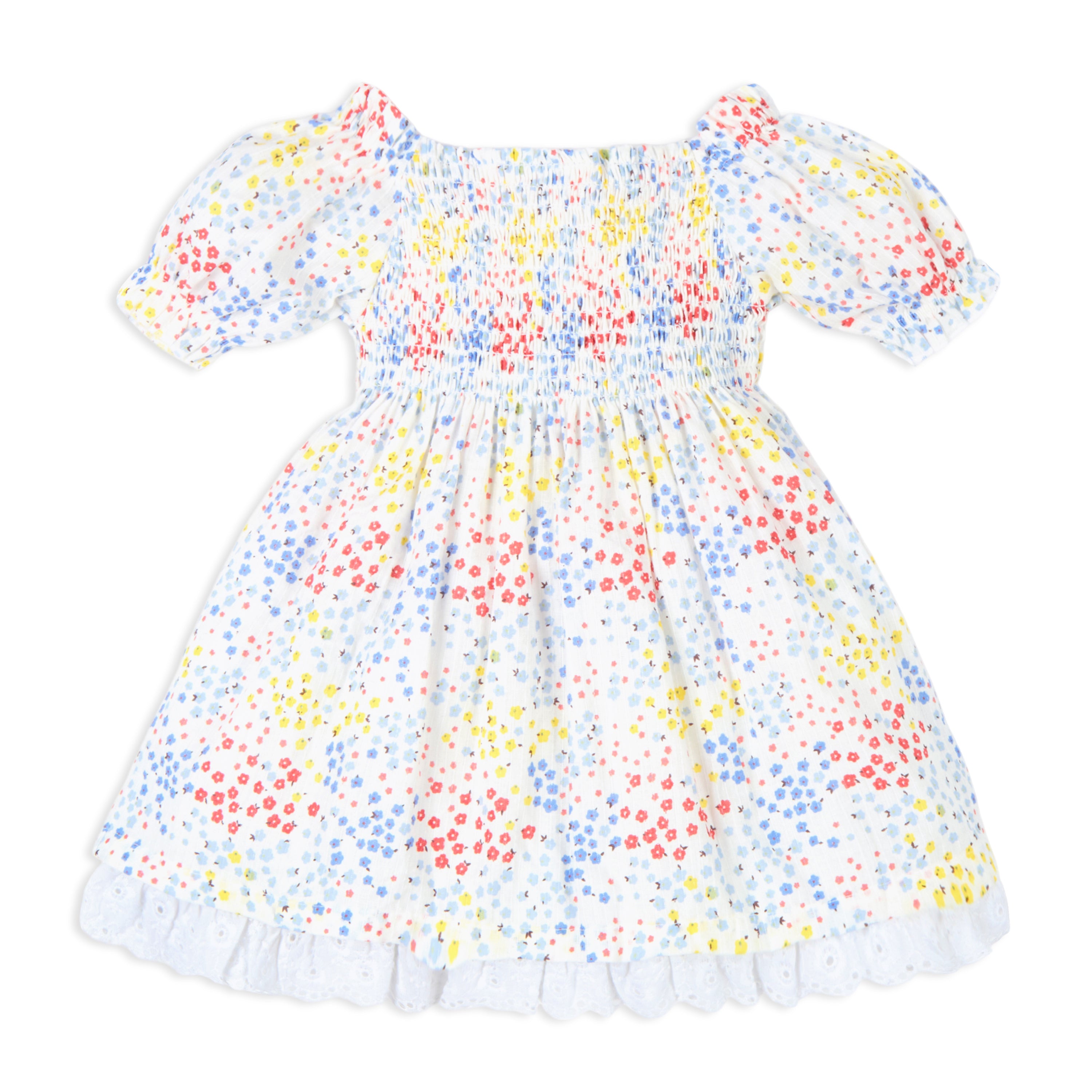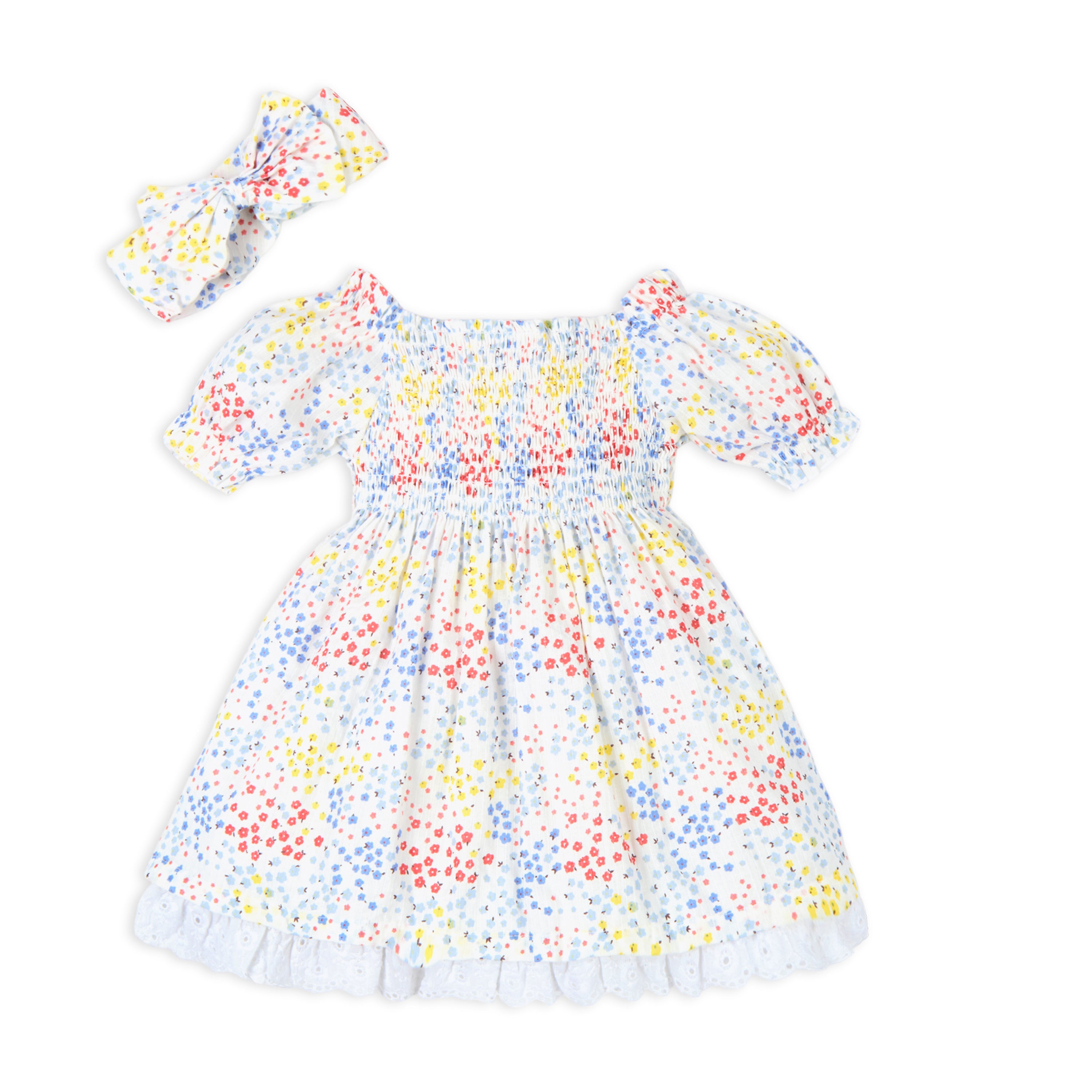 Made from 100% cotton, ditsy print floral dress with puff sleeves and smocking details with matching hairband.