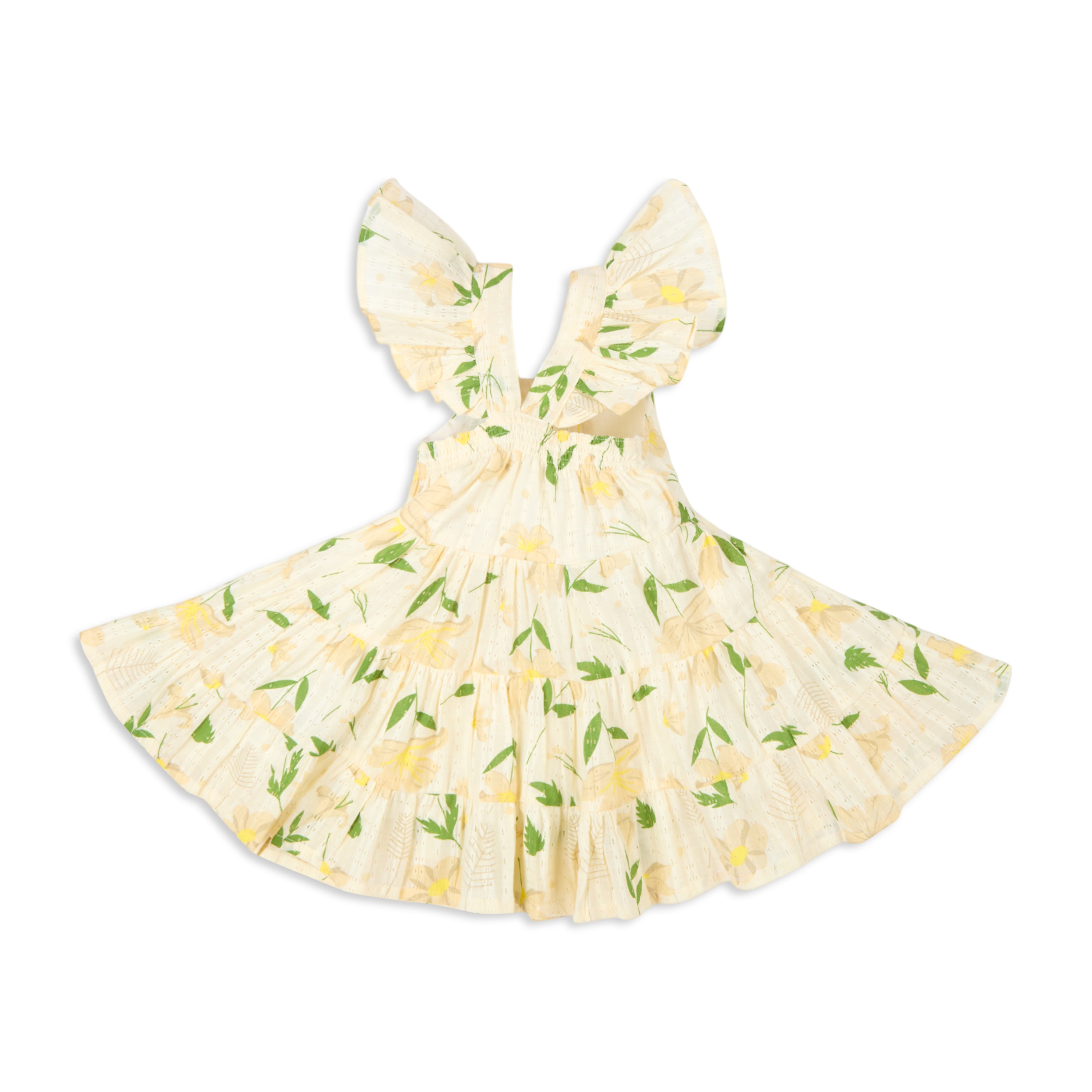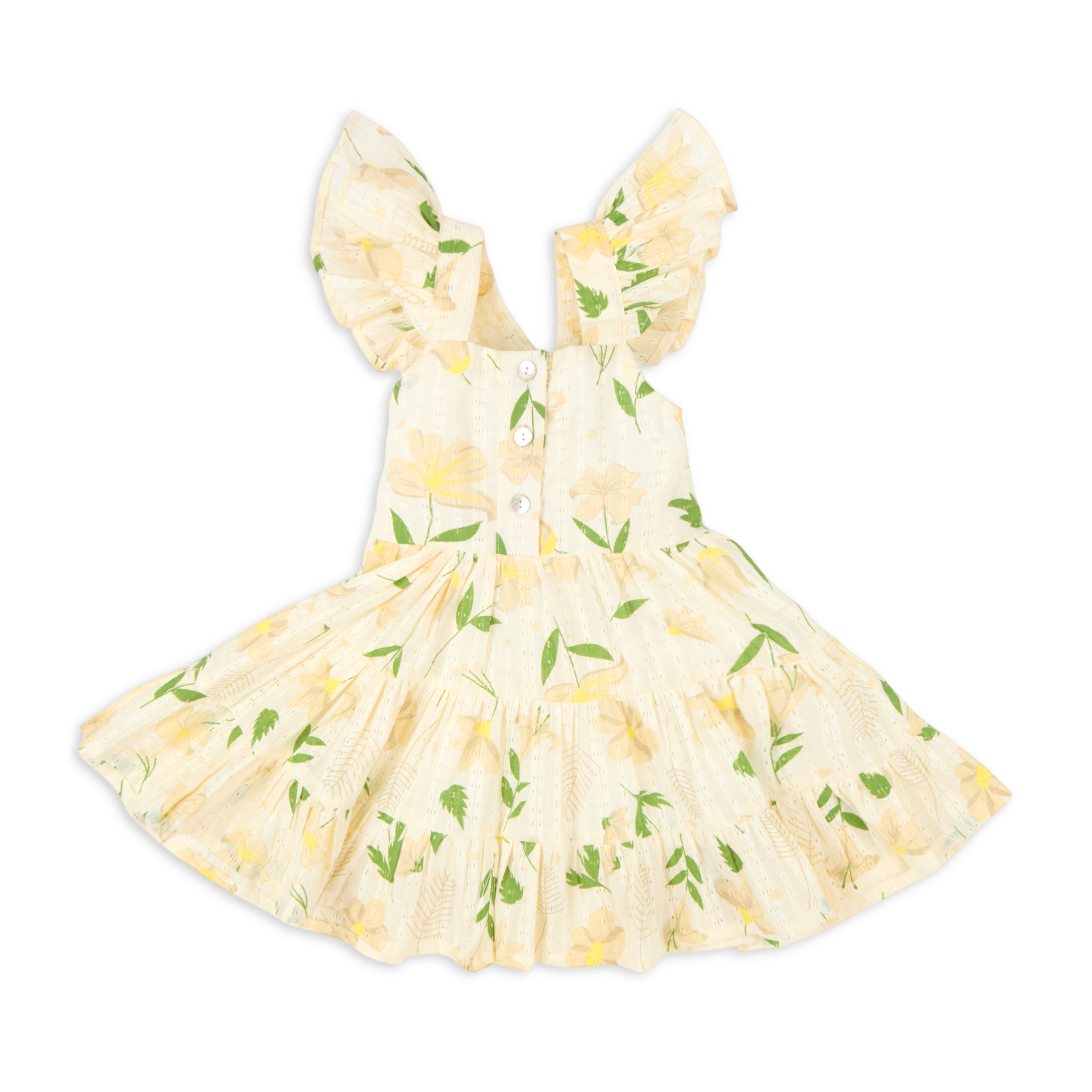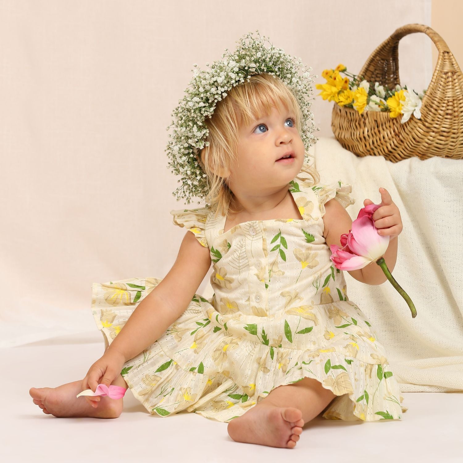 Made from 100% cotton floral eyelet fabric, ruffle sleeves rah-rah dress front open style shell buttons with bloomer & matching hairband.