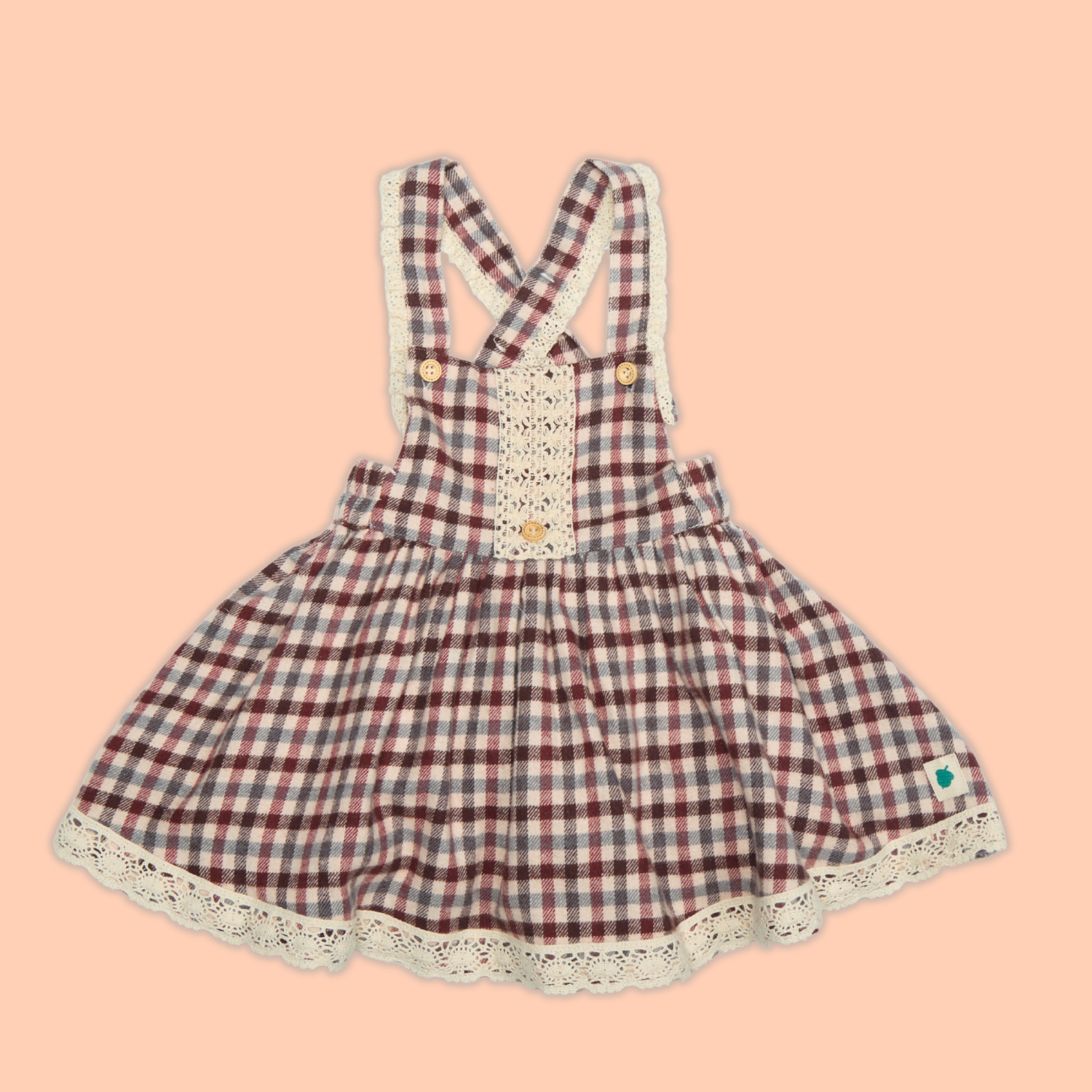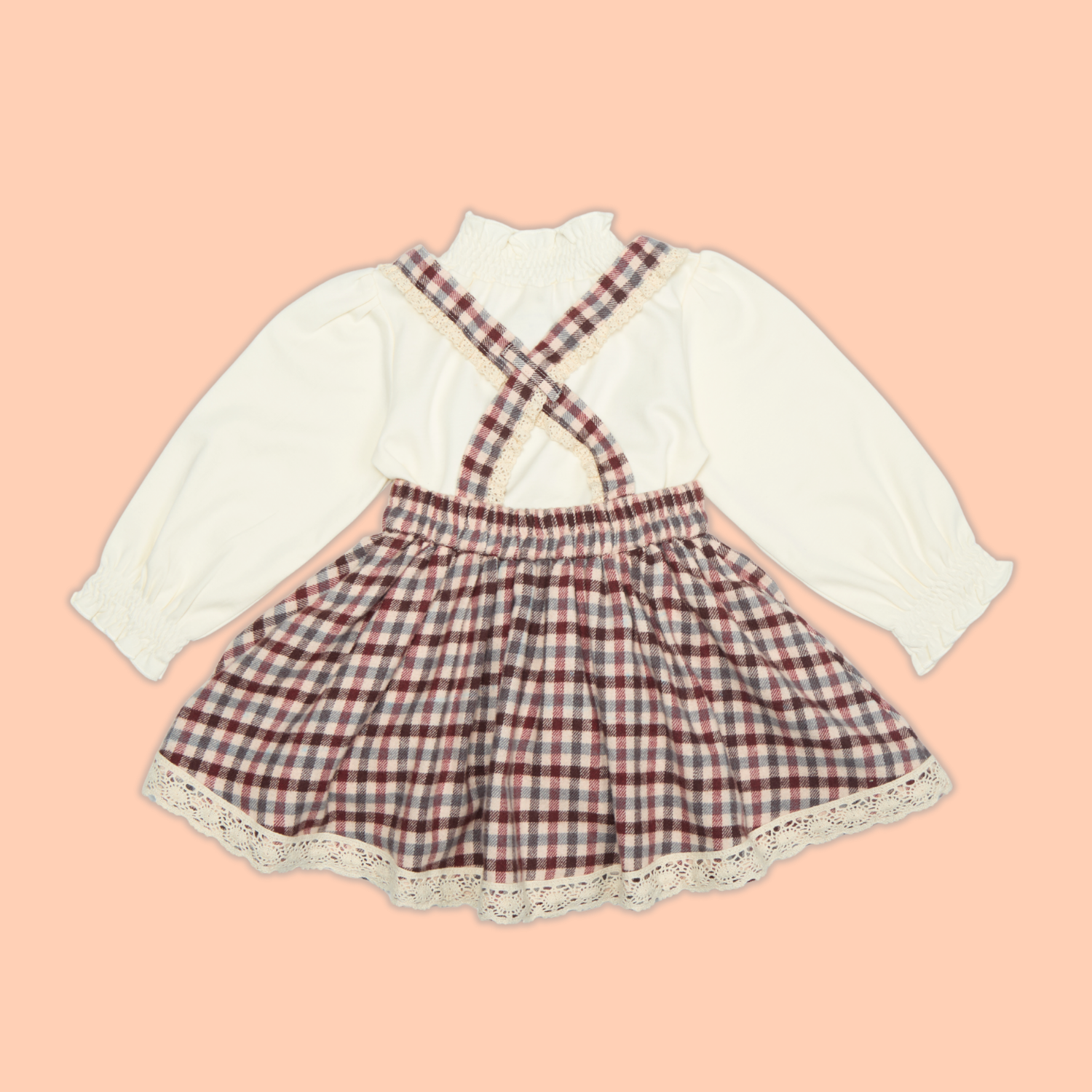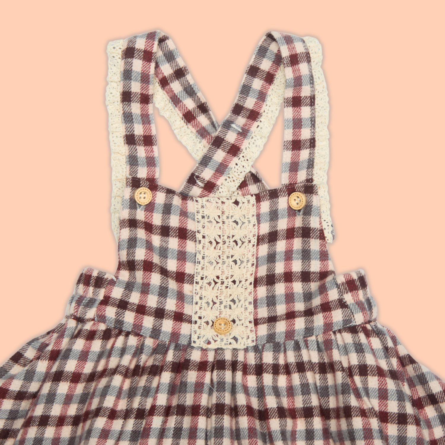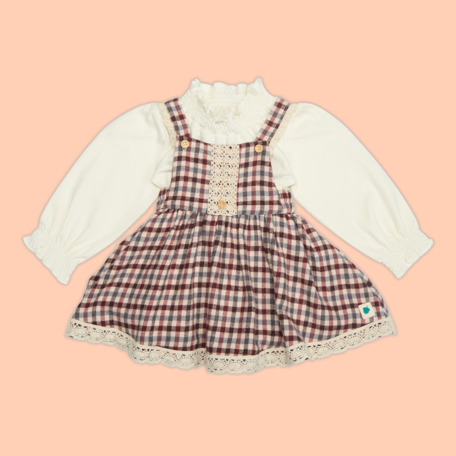 Bring classic charm to your little one’s wardrobe with the My Milestones Burberry Gingham Dungaree Dress Set. Featuring a multicolor gingham dungaree with crochet lace details and a soft vanilla full-sleeve tee, this breathable set keeps your baby stylish and comfy for any occasion.