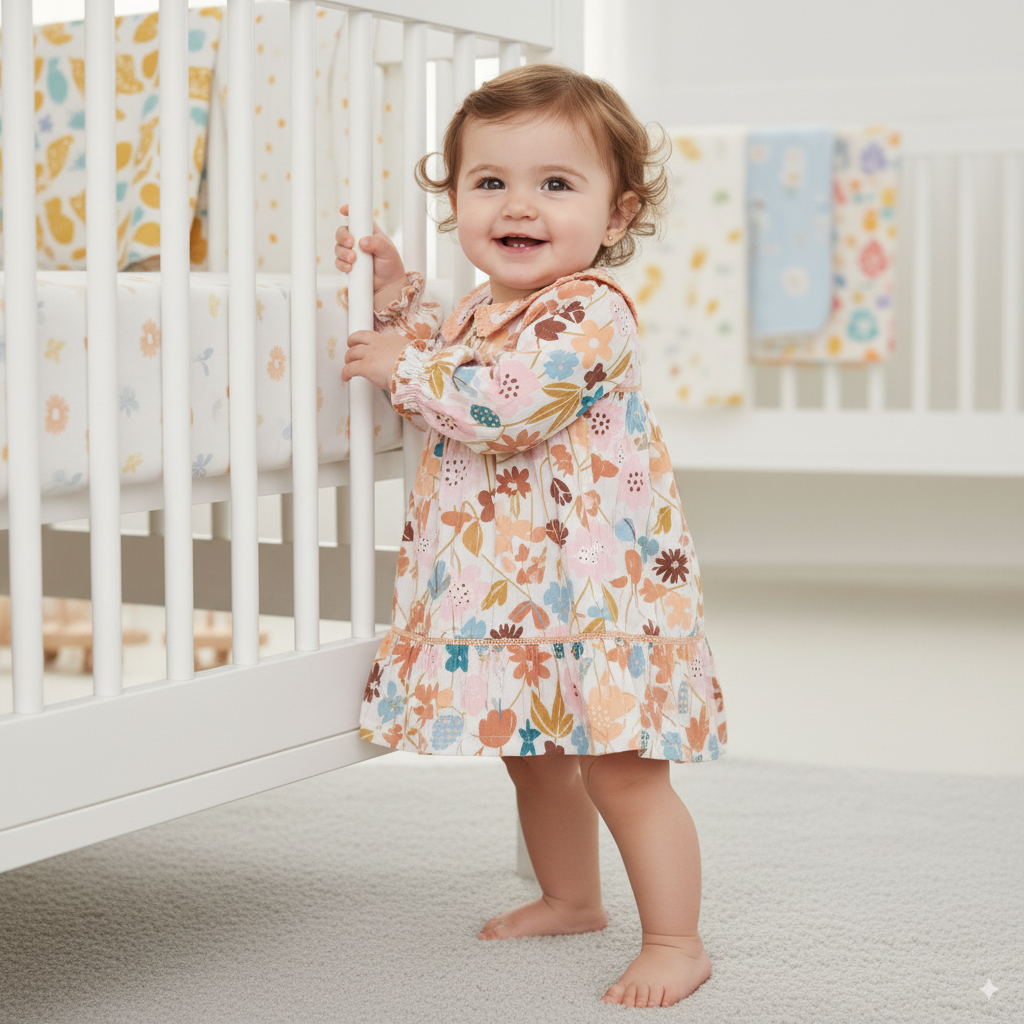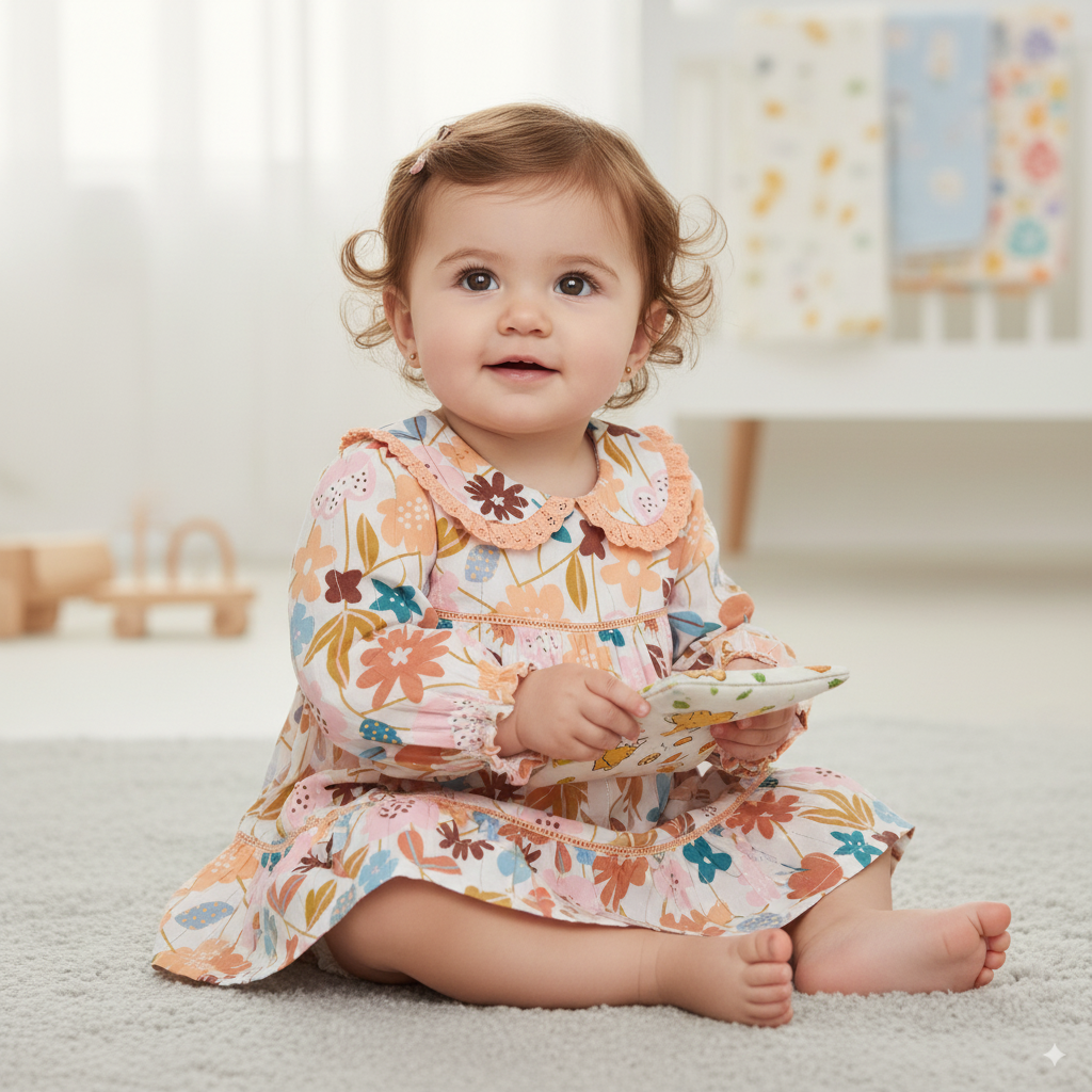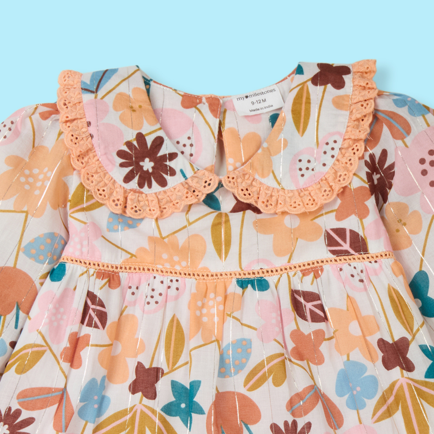 Add sparkle to your little one’s wardrobe with the My Milestones Madela Lurex Tiered Dress. Made from soft cotton with subtle lurex accents, this floral tiered dress features a lace-trim neckline and comes with a matching bloomer—perfect for outings, parties, or everyday wear.