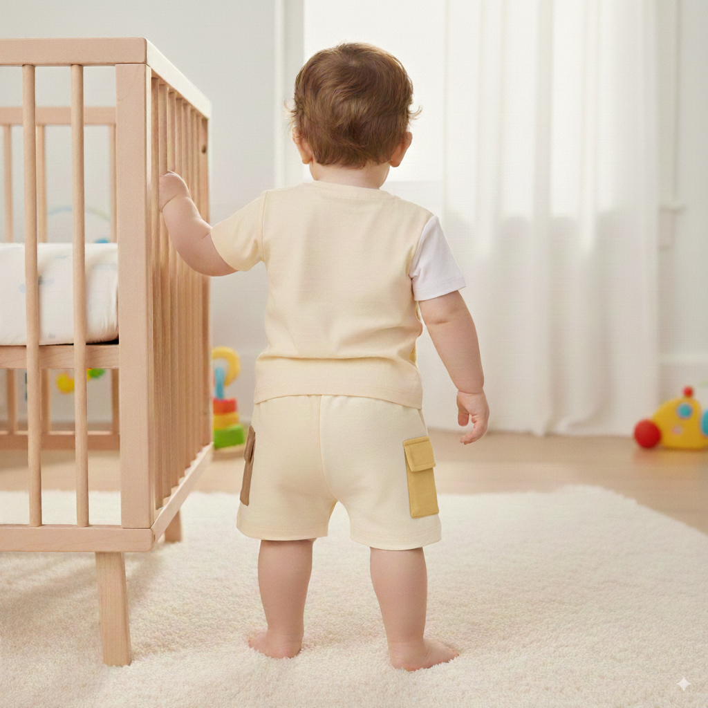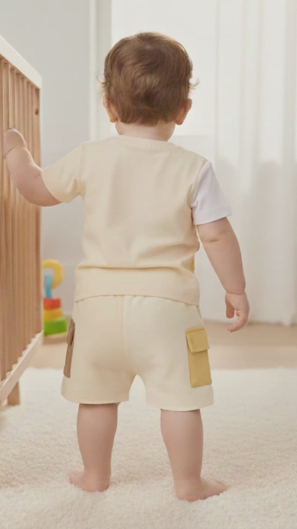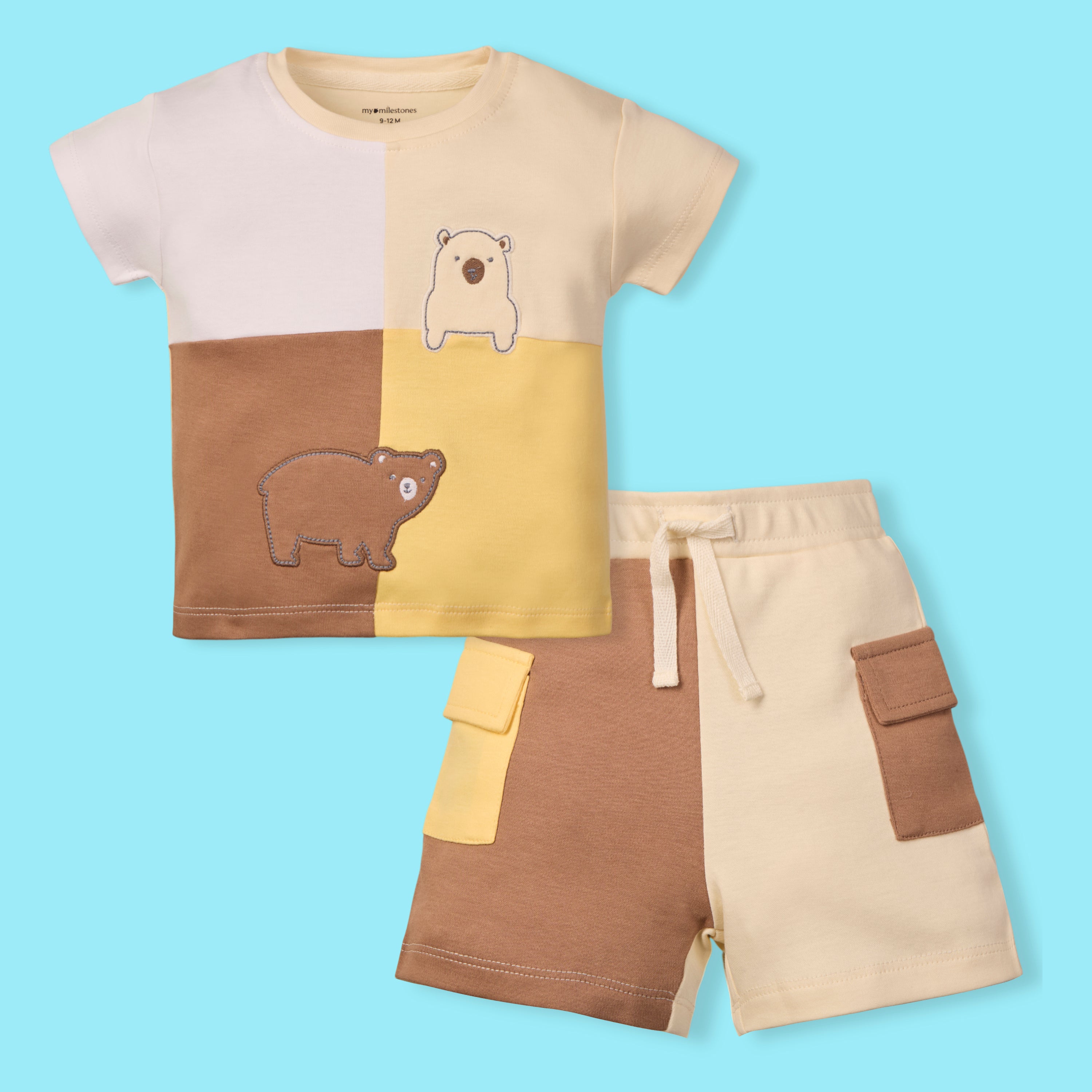 Brighten your little one’s wardrobe with the My Milestones Little Cub Color-Block Co-Ord Set. Made from soft, breathable cotton, this playful outfit features a colorblock tee with bear appliqués and matching drawstring cargo shorts—perfect for style and active days.