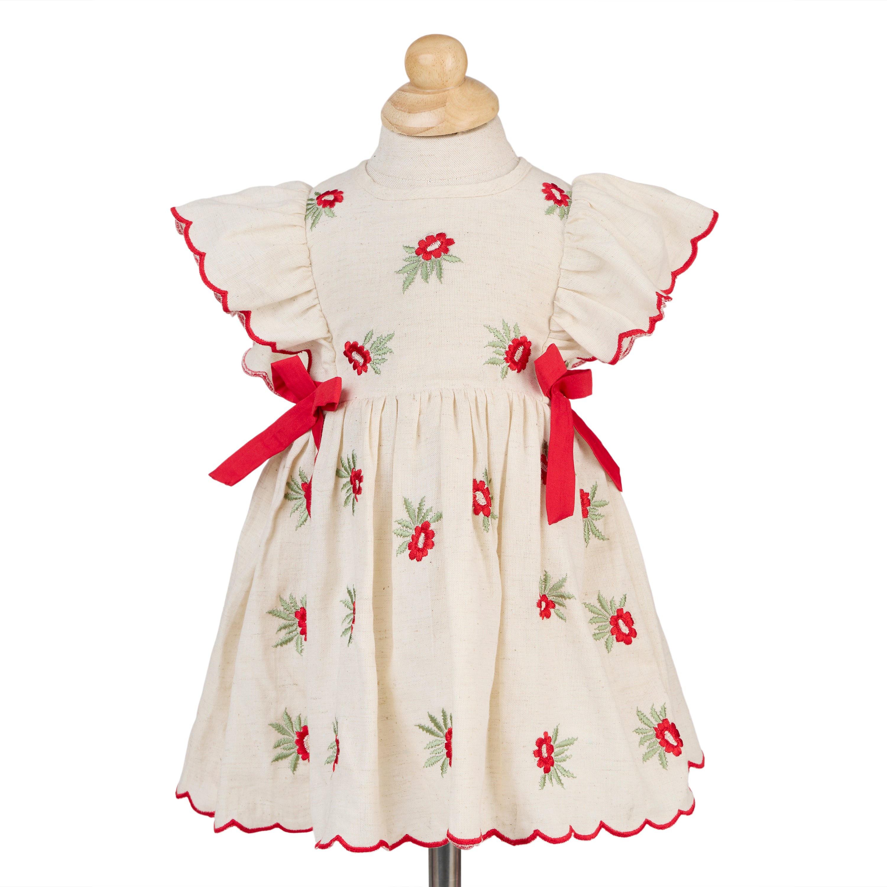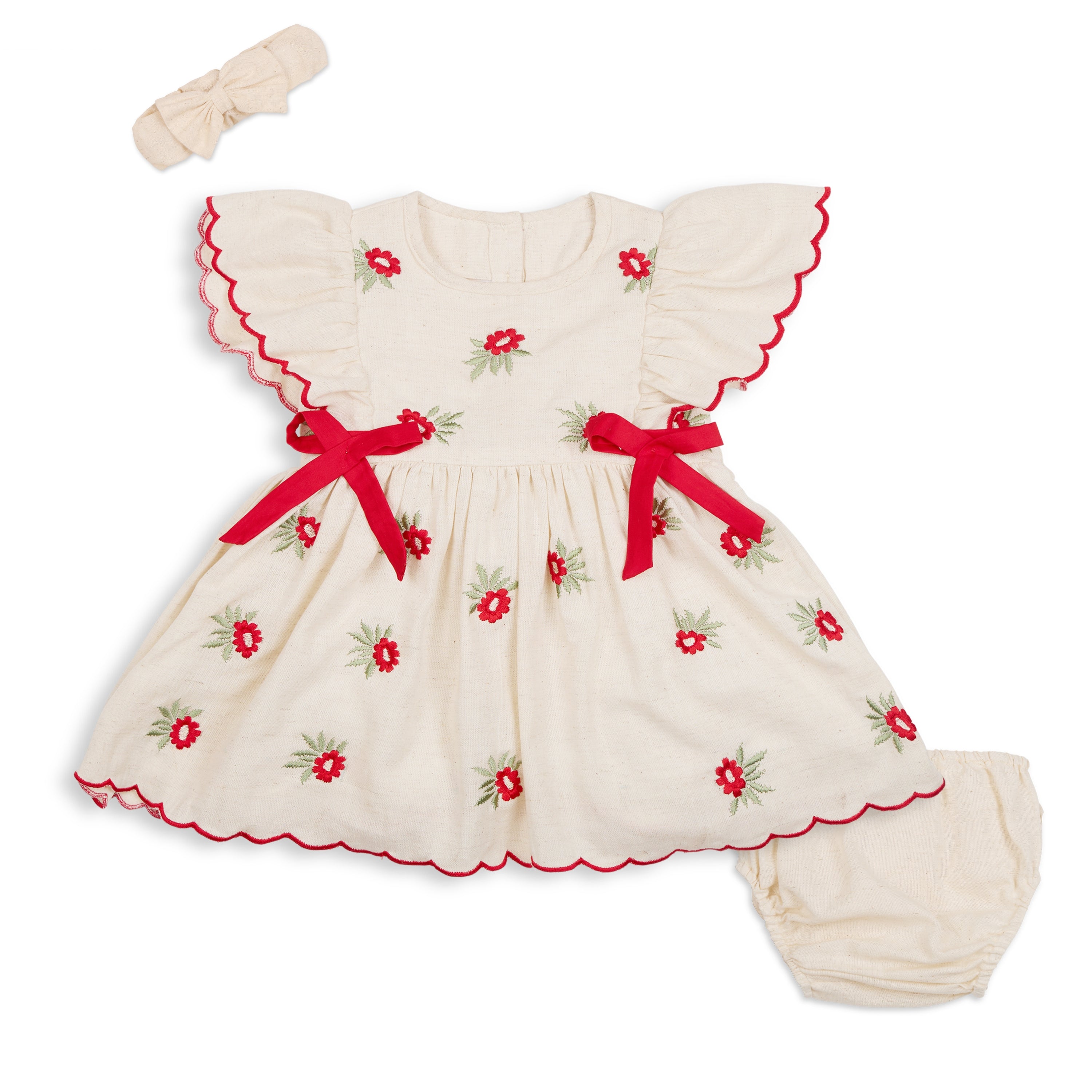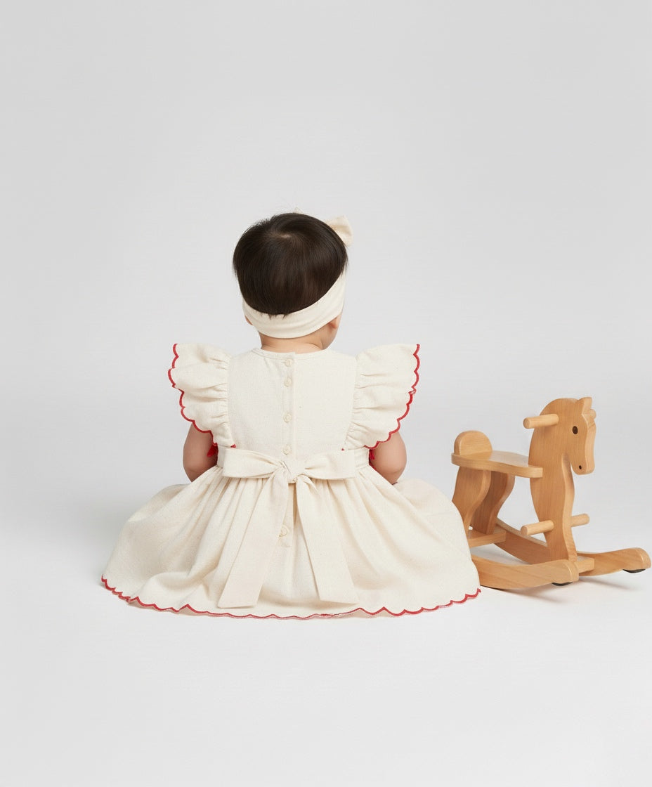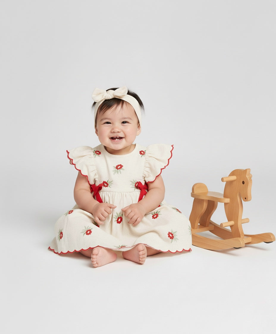 Blooming in ivory and cherry-red, The Amaryllis is a pure-cotton occasionwear dress kissed with dainty floral embroidery. Flutter sleeves are edged with scalloped ric-rac, while neat red bow accents frame the waist above a softly gathered skirt. A matching floral hairband and coordinating bloomer complete the picture—sweet, polished, and celebration-ready.