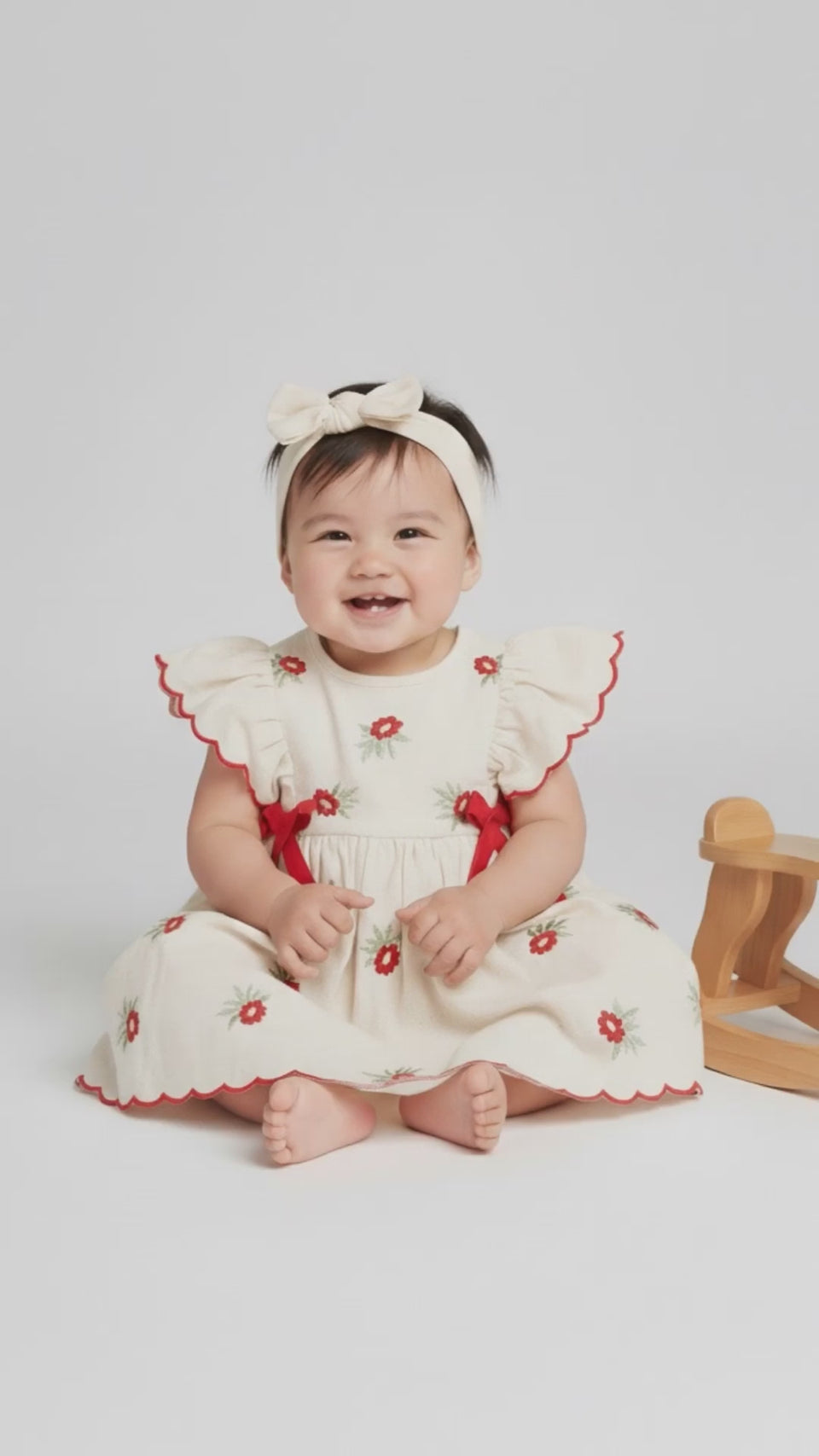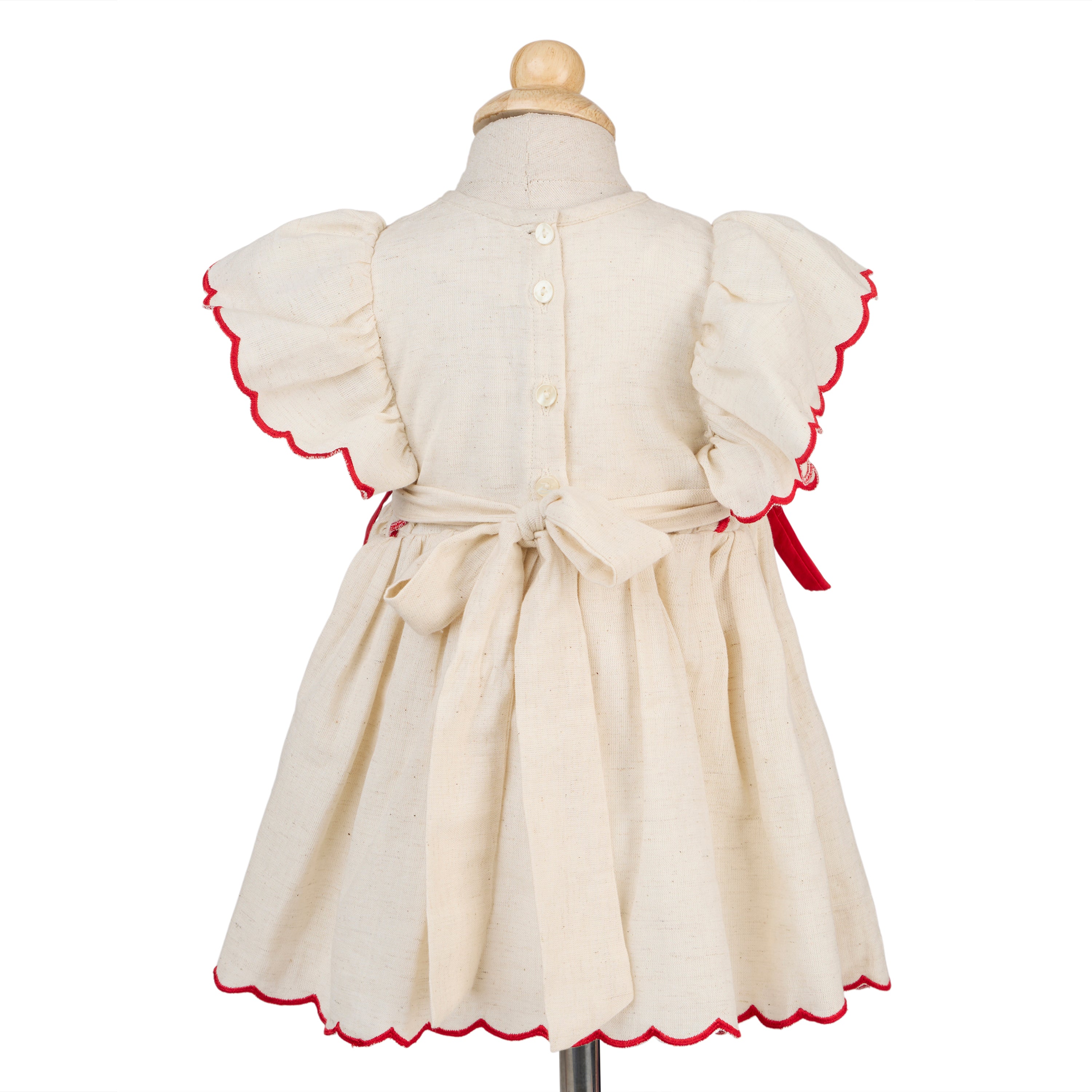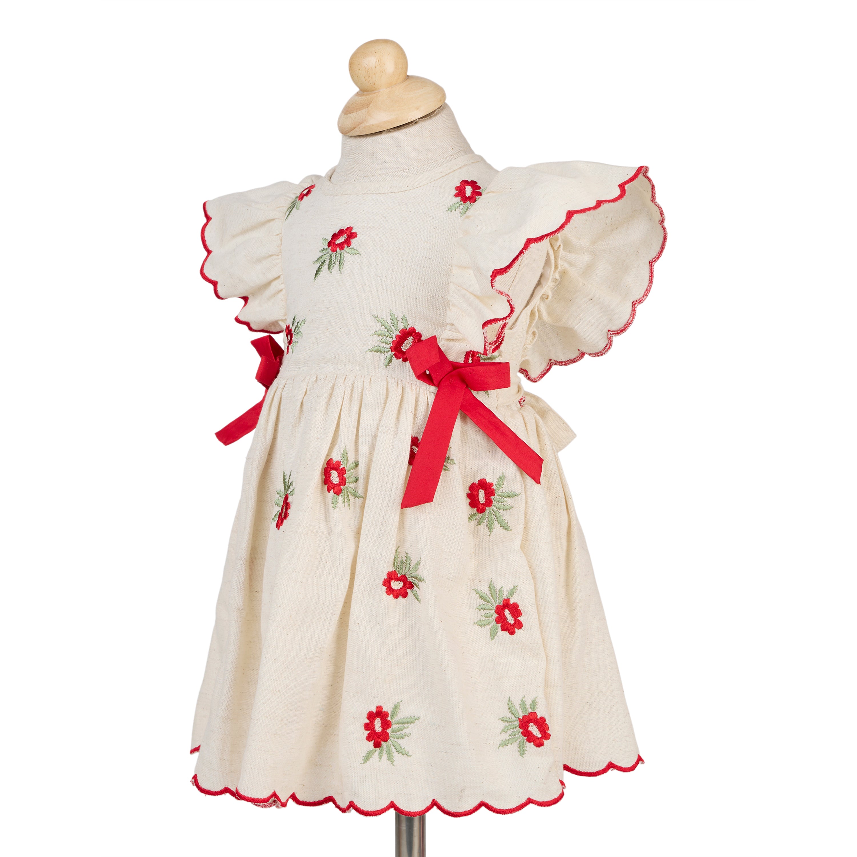 Blooming in ivory and cherry-red, The Amaryllis is a pure-cotton occasionwear dress kissed with dainty floral embroidery. Flutter sleeves are edged with scalloped ric-rac, while neat red bow accents frame the waist above a softly gathered skirt. A matching floral hairband and coordinating bloomer complete the picture—sweet, polished, and celebration-ready.
