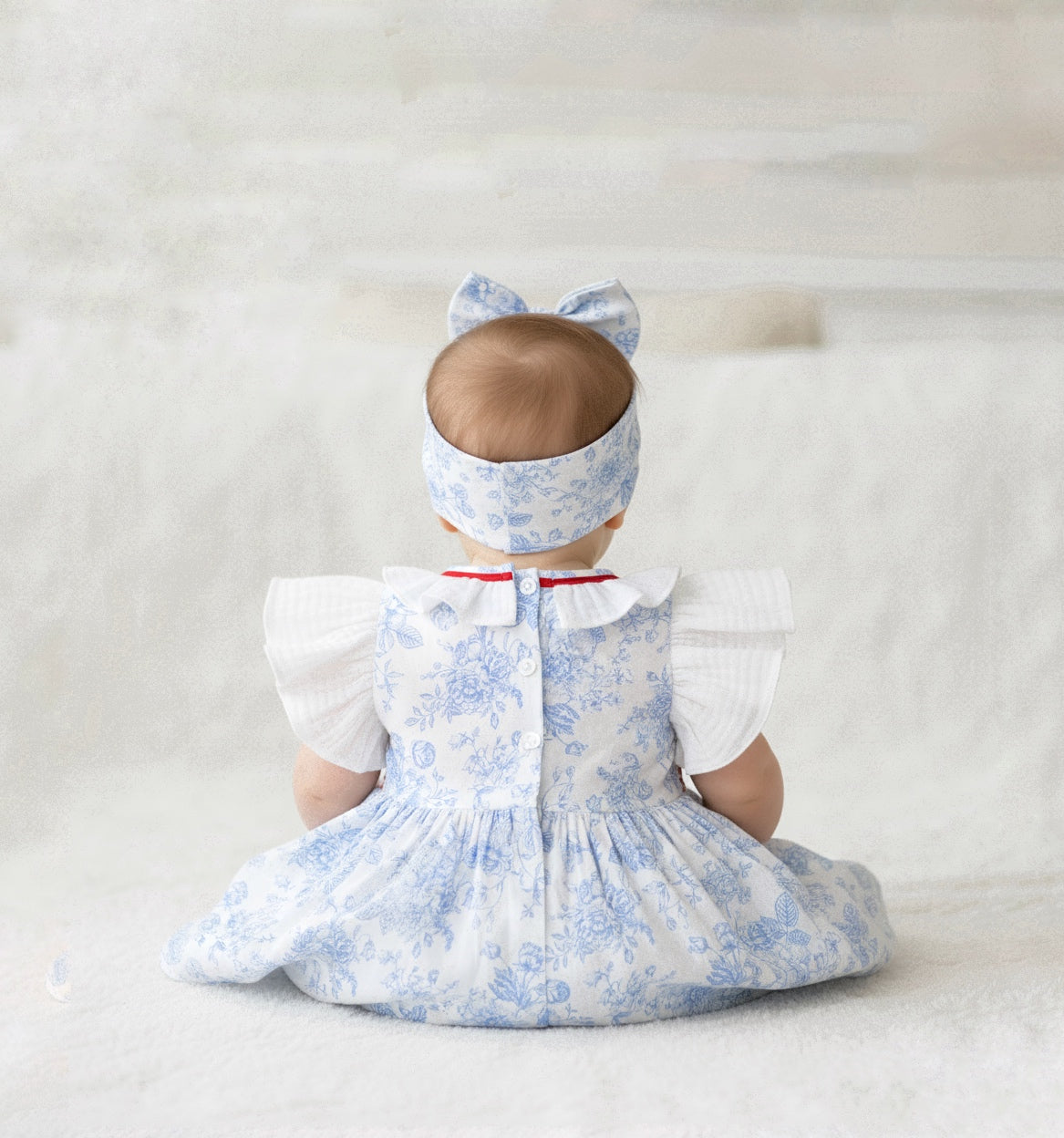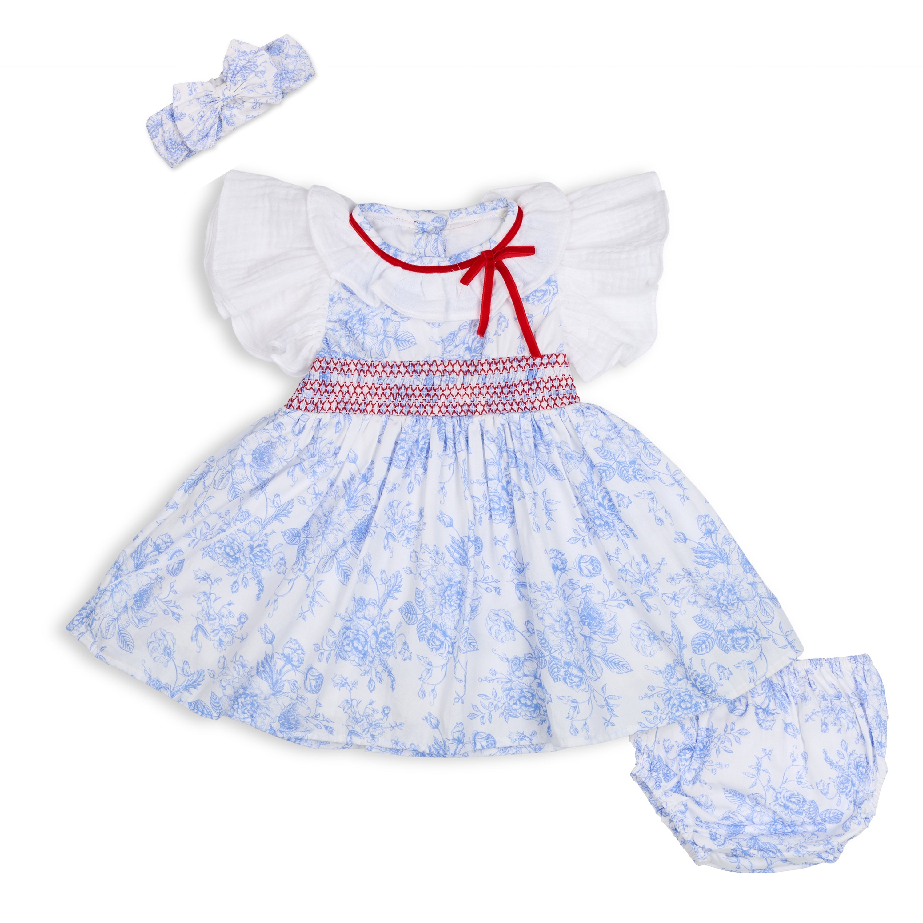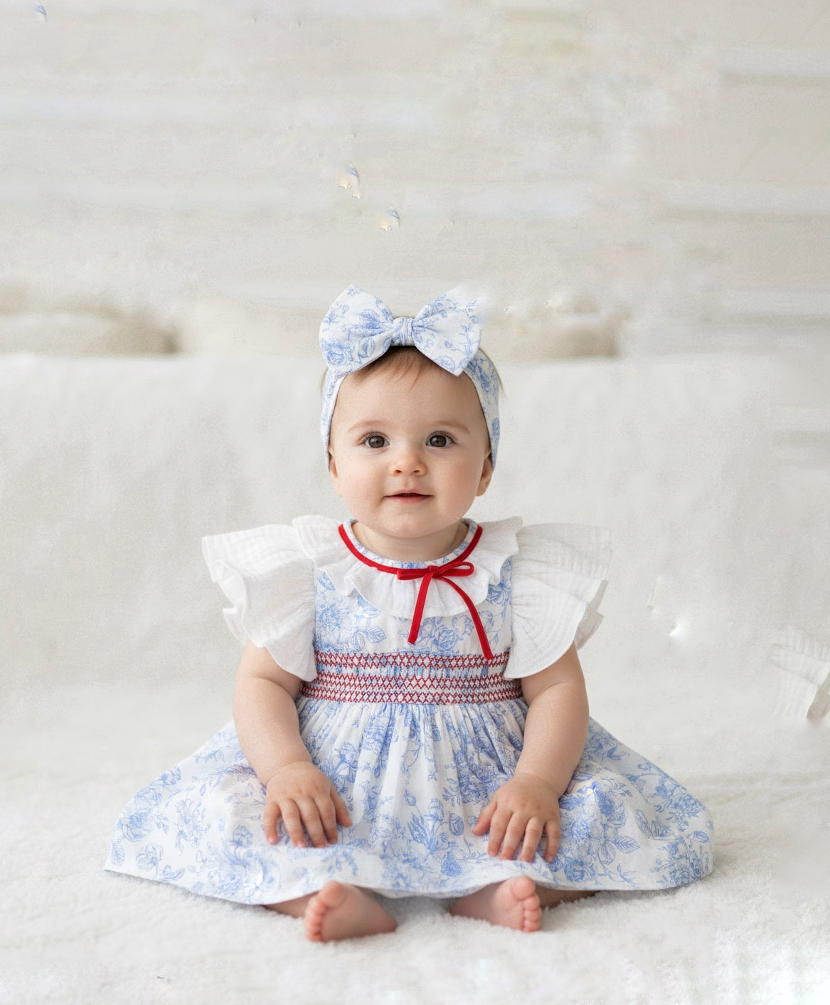 Timeless and enchanting, the Charlotte blooms in a porcelain-blue toile—classic, picture-perfect, and made for little celebrations. A contrast red ribbon bow kisses the neckline, while the artful smocked waistband adds gentle structure above a softly gathered skirt. Finished with airy puff sleeves, the set includes a matching toile hairband and coordinating bloomer for a complete, polished look.