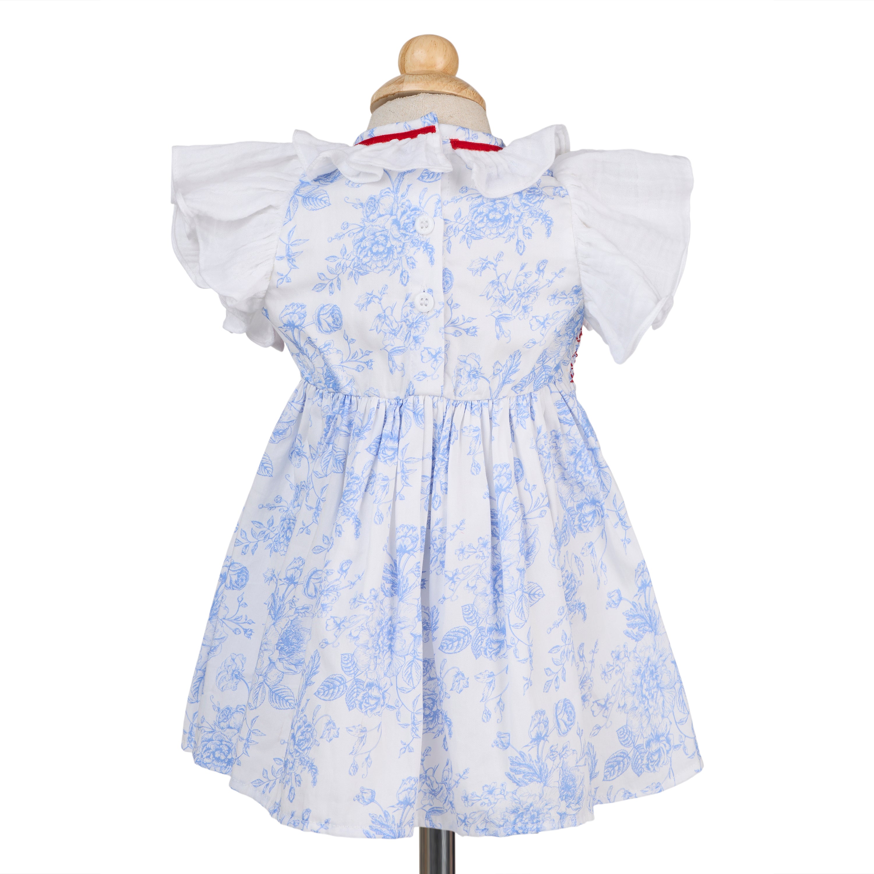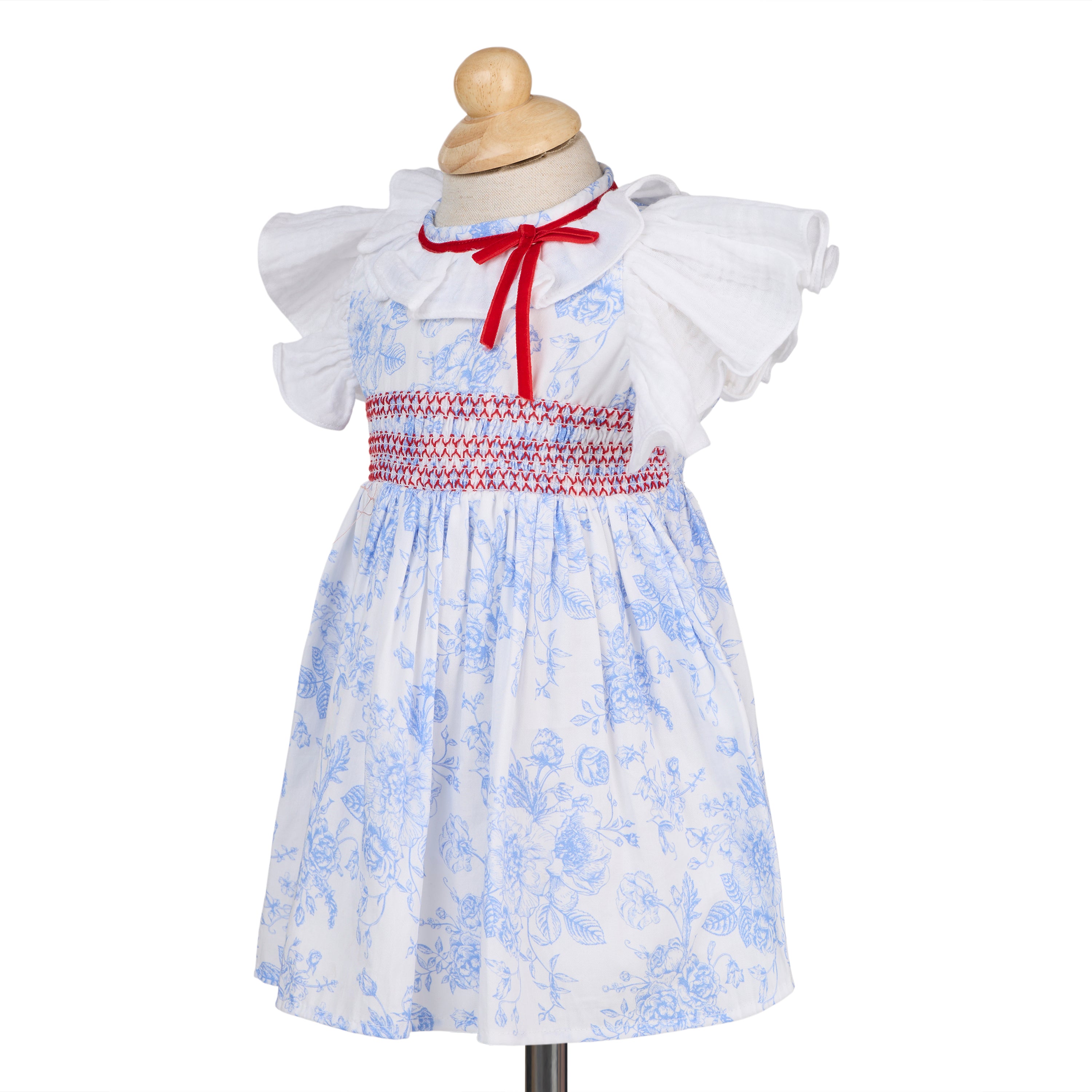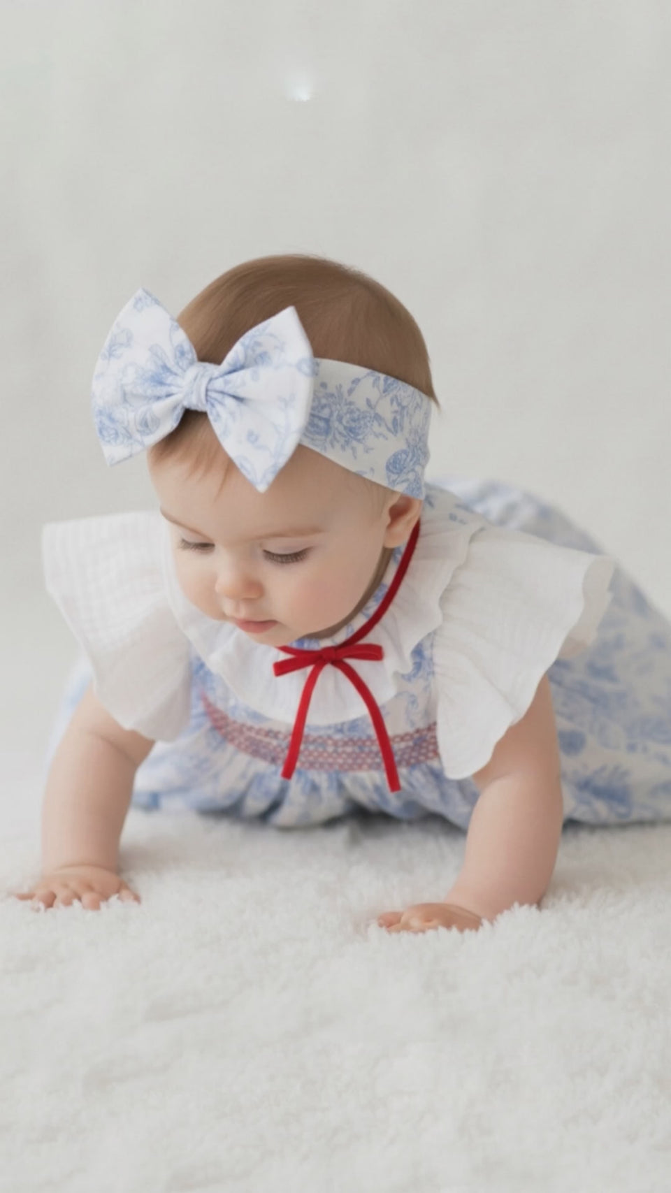 Timeless and enchanting, the Charlotte blooms in a porcelain-blue toile—classic, picture-perfect, and made for little celebrations. A contrast red ribbon bow kisses the neckline, while the artful smocked waistband adds gentle structure above a softly gathered skirt. Finished with airy puff sleeves, the set includes a matching toile hairband and coordinating bloomer for a complete, polished look.