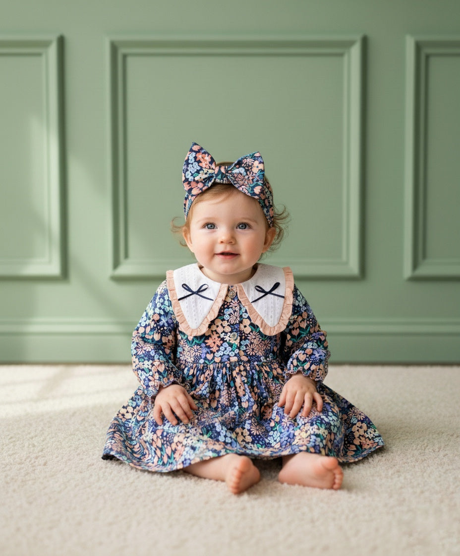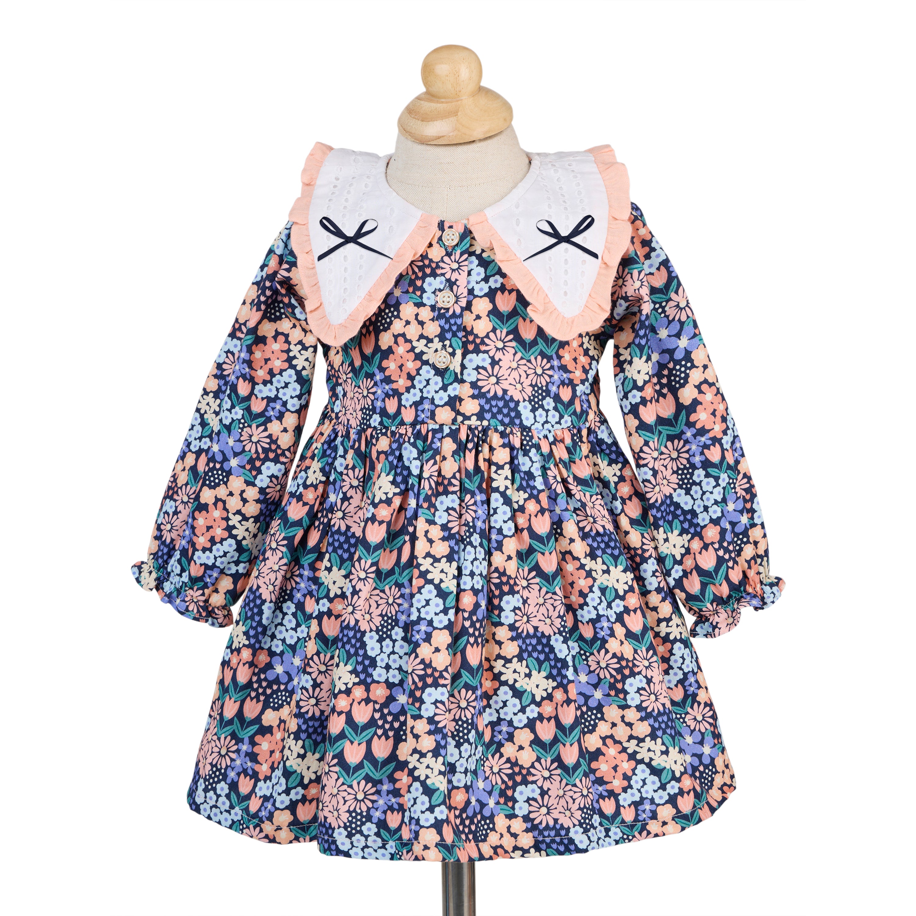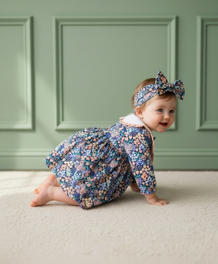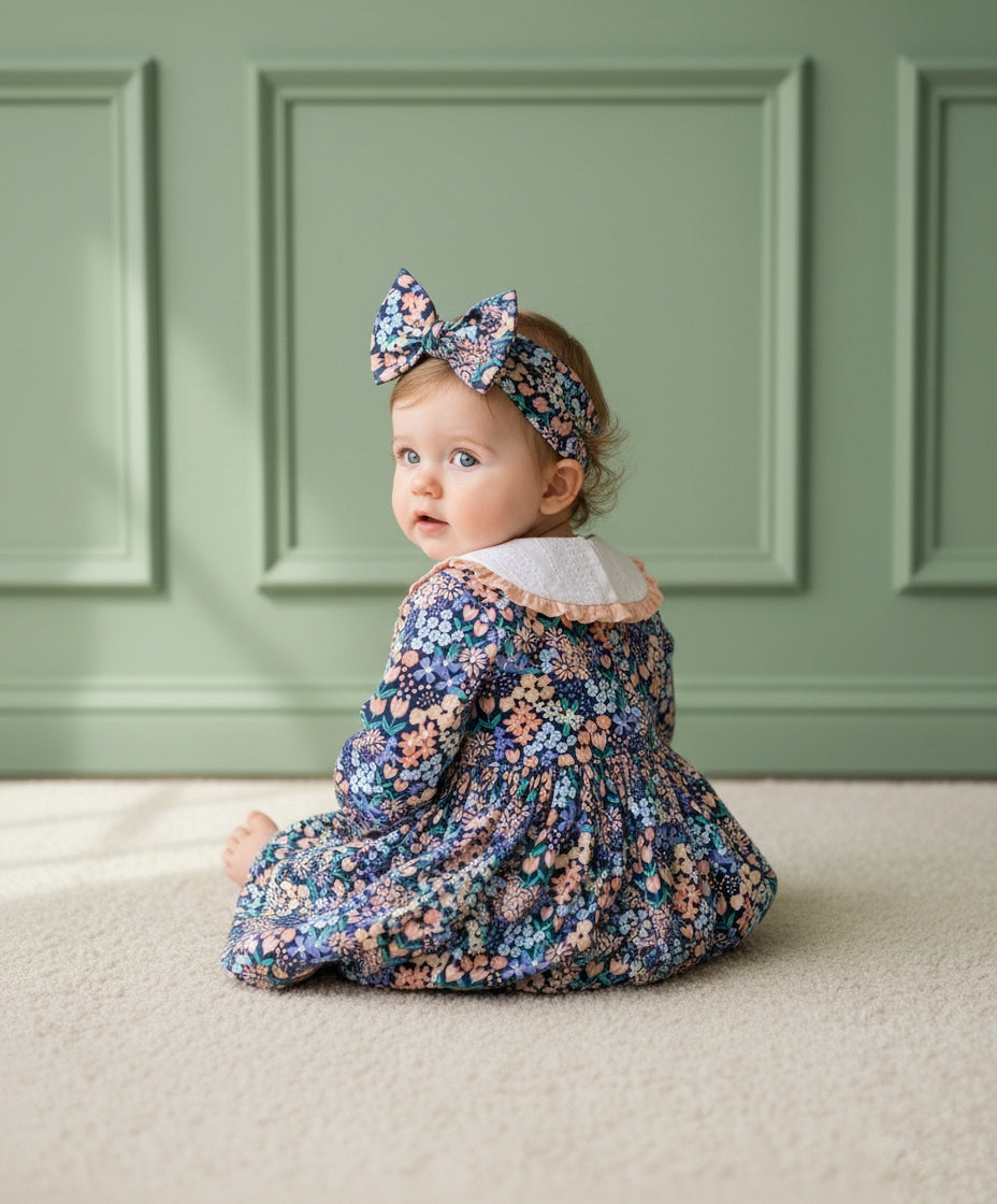 Blooming with charm, the Florabelle is a long-sleeve occasionwear dress in a painterly floral, framed by a statement Peter Pan collar—white eyelet with scalloped peach edging and tiny navy bows. Soft gathers create a floaty, photo-ready silhouette. A matching floral hairband and coordinating bloomer complete the set—sweet, polished, and ready for every little celebration.
