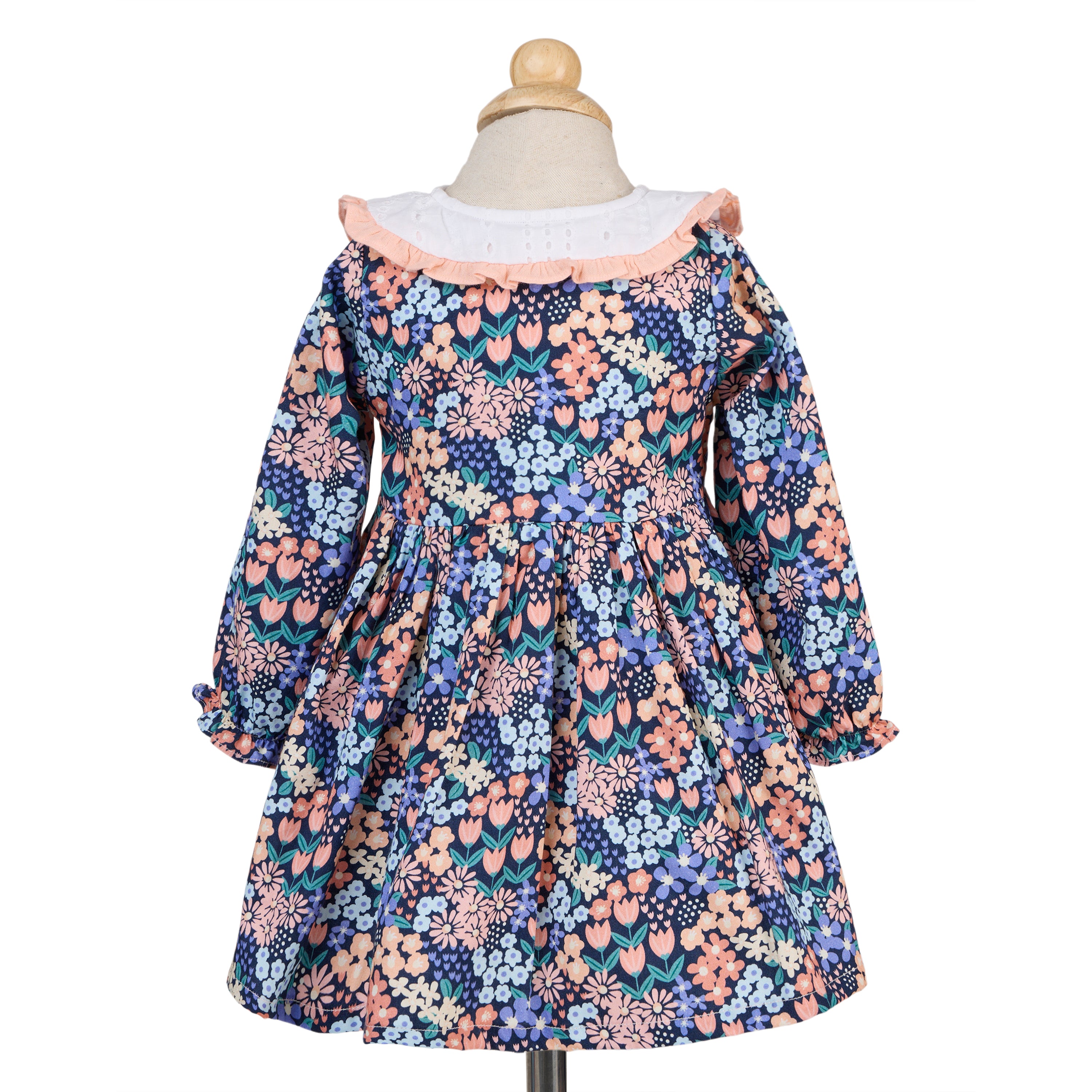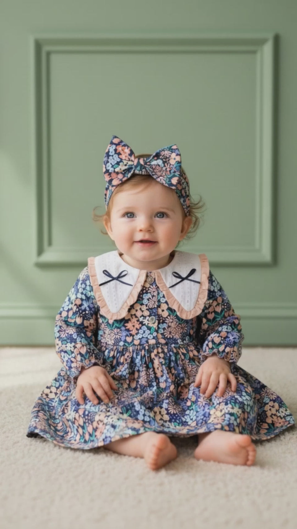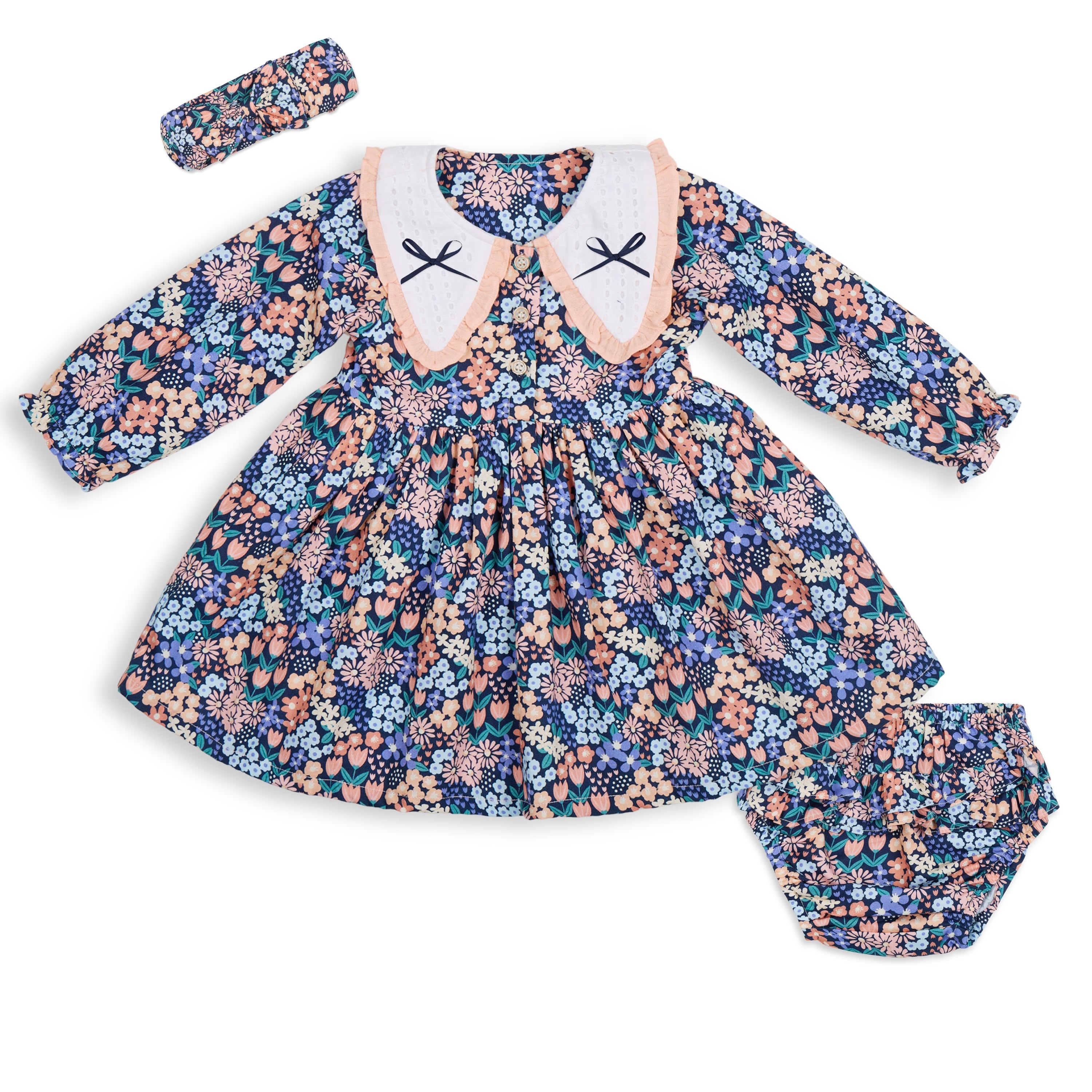 Blooming with charm, the Florabelle is a long-sleeve occasionwear dress in a painterly floral, framed by a statement Peter Pan collar—white eyelet with scalloped peach edging and tiny navy bows. Soft gathers create a floaty, photo-ready silhouette. A matching floral hairband and coordinating bloomer complete the set—sweet, polished, and ready for every little celebration.