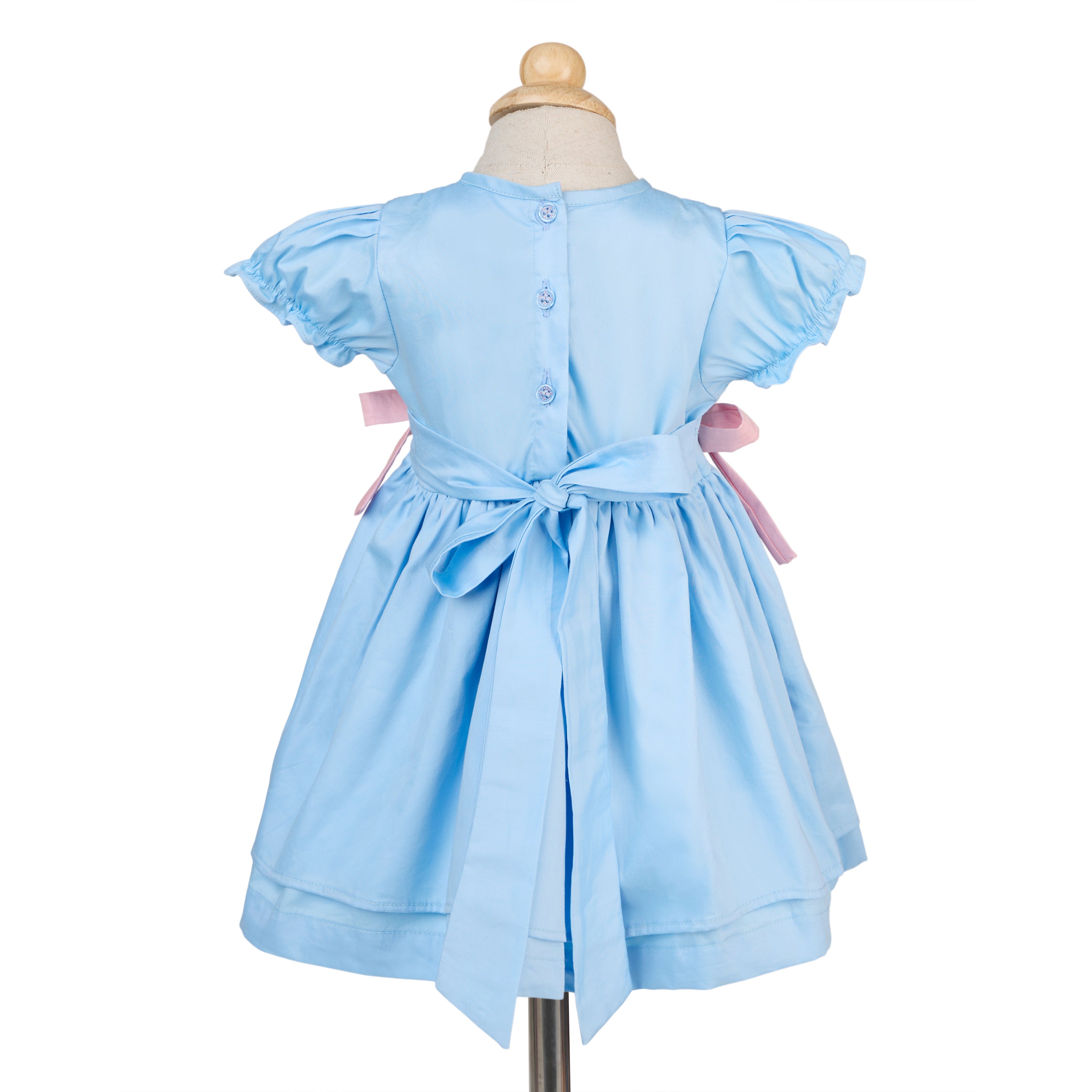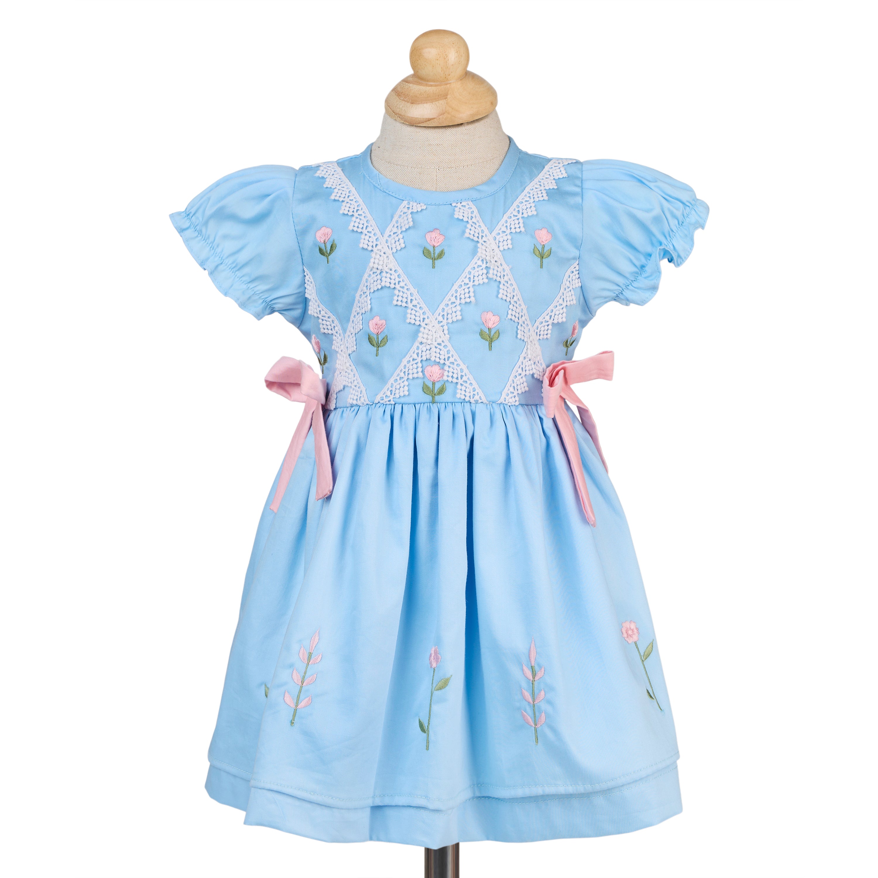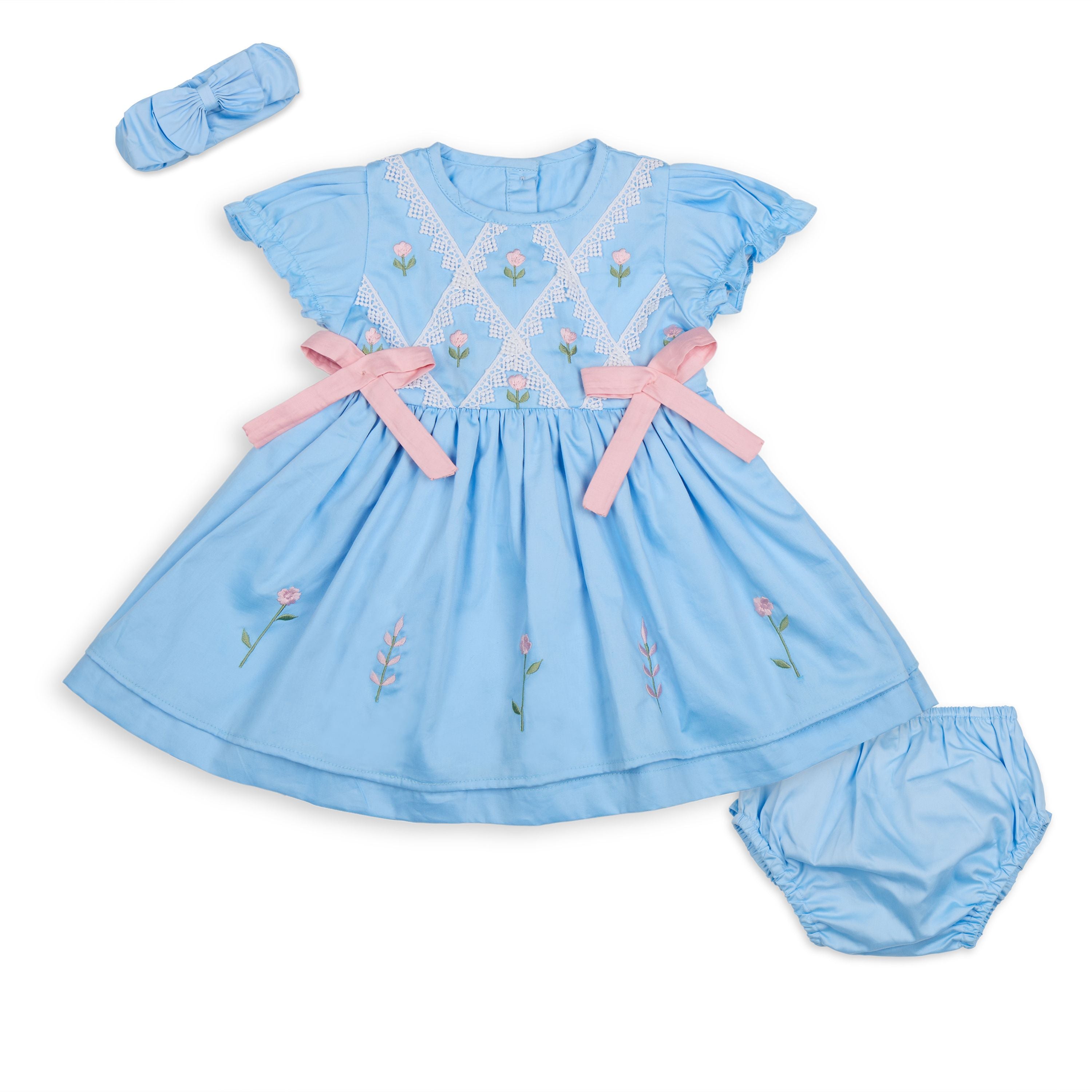 A pastel blue pure cotton occasionwear dress, beautifully detailed with floral embroidery and crisscross lace on the bodice. Accented with pink satin bows at the waist, it features a graceful two-layer flounce that adds fullness and charm to the silhouette. Completed with matching ruffle bloomers and a bow headband, this ensemble is designed for timeless elegance at every celebration.