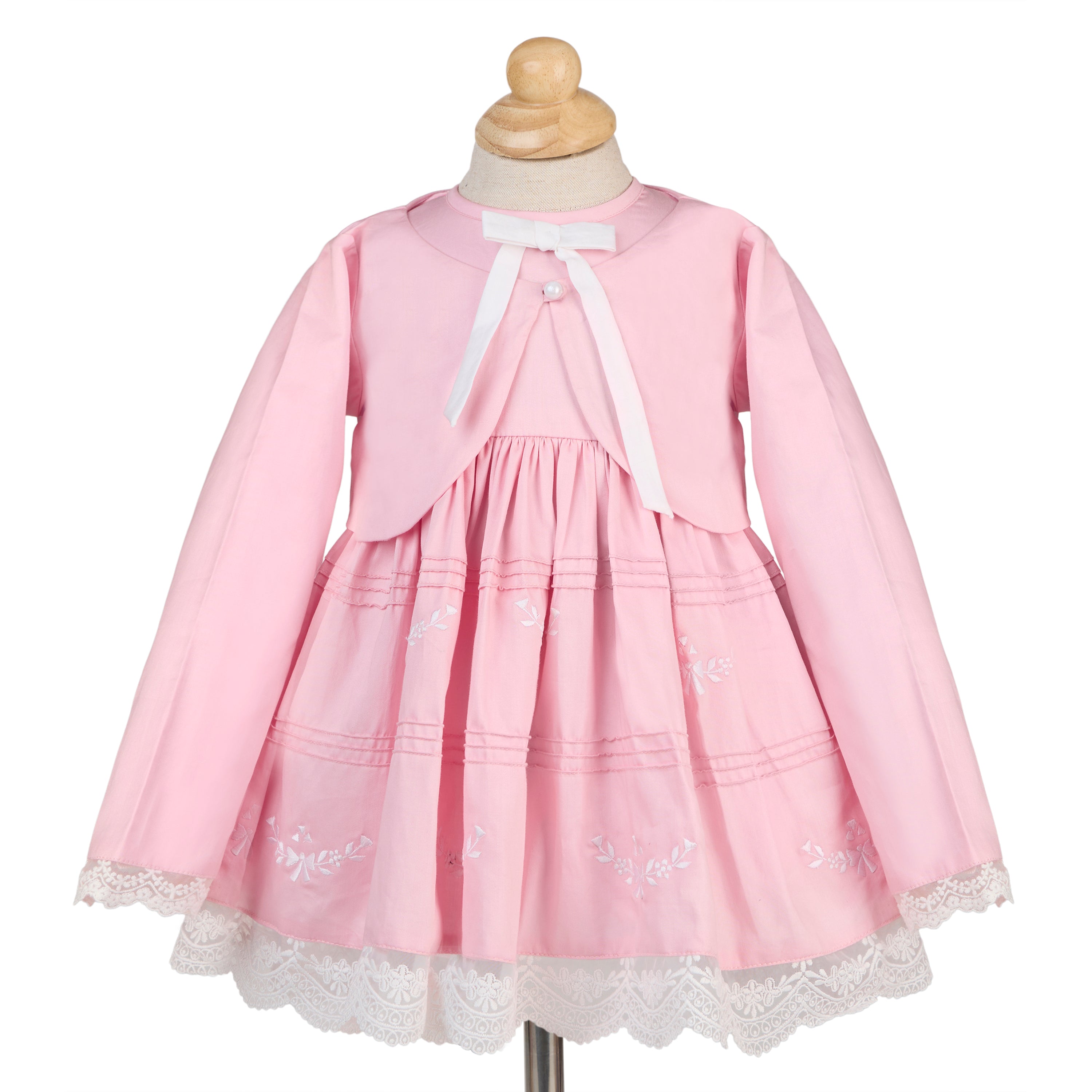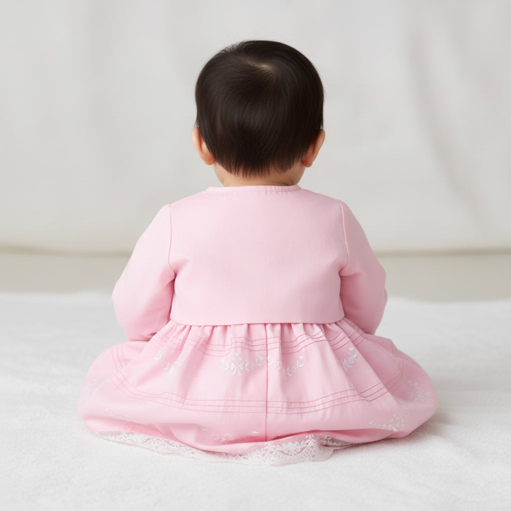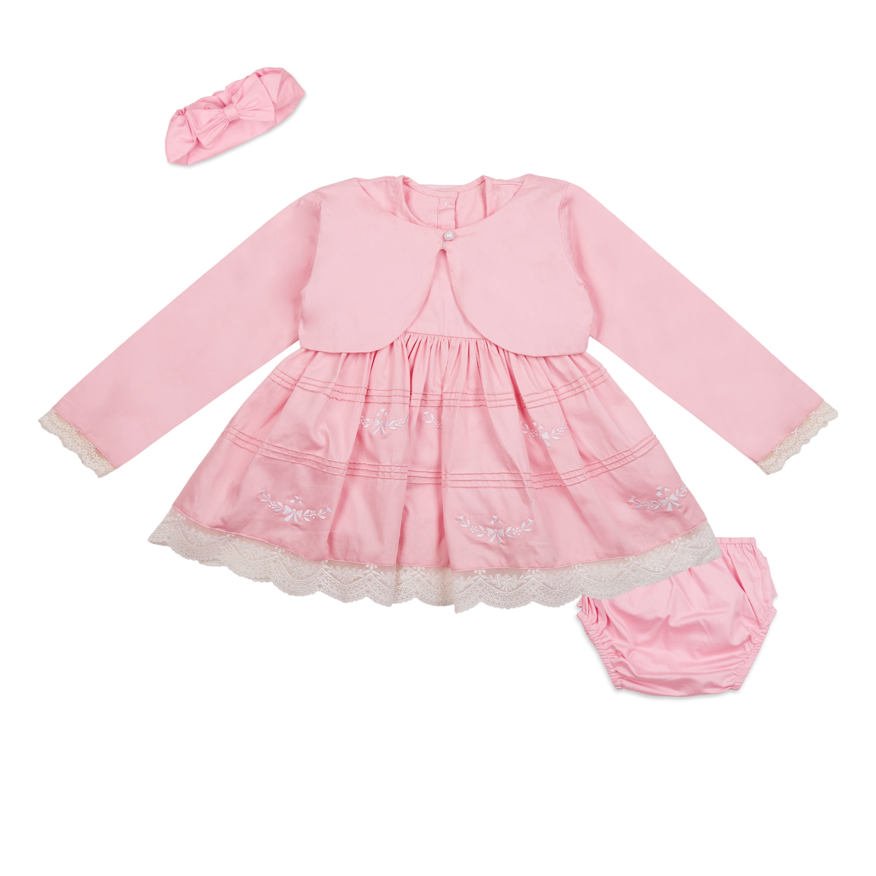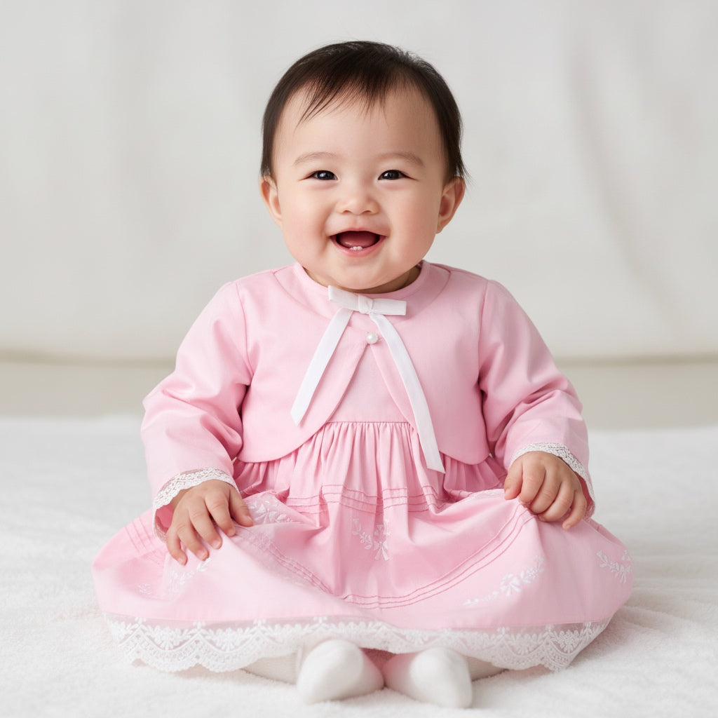 A whisper-soft rose for her biggest little moments. This occasionwear set features a long-sleeve baby dress with a coordinating bolero jacket, finished with fine pintucks and delicate tonal embroidery. Scalloped lace trims the cuffs and hem for an heirloom touch, while the matching bow hairband and coordinating bloomer complete the picture-perfect look—ideal from ceremony to celebration.