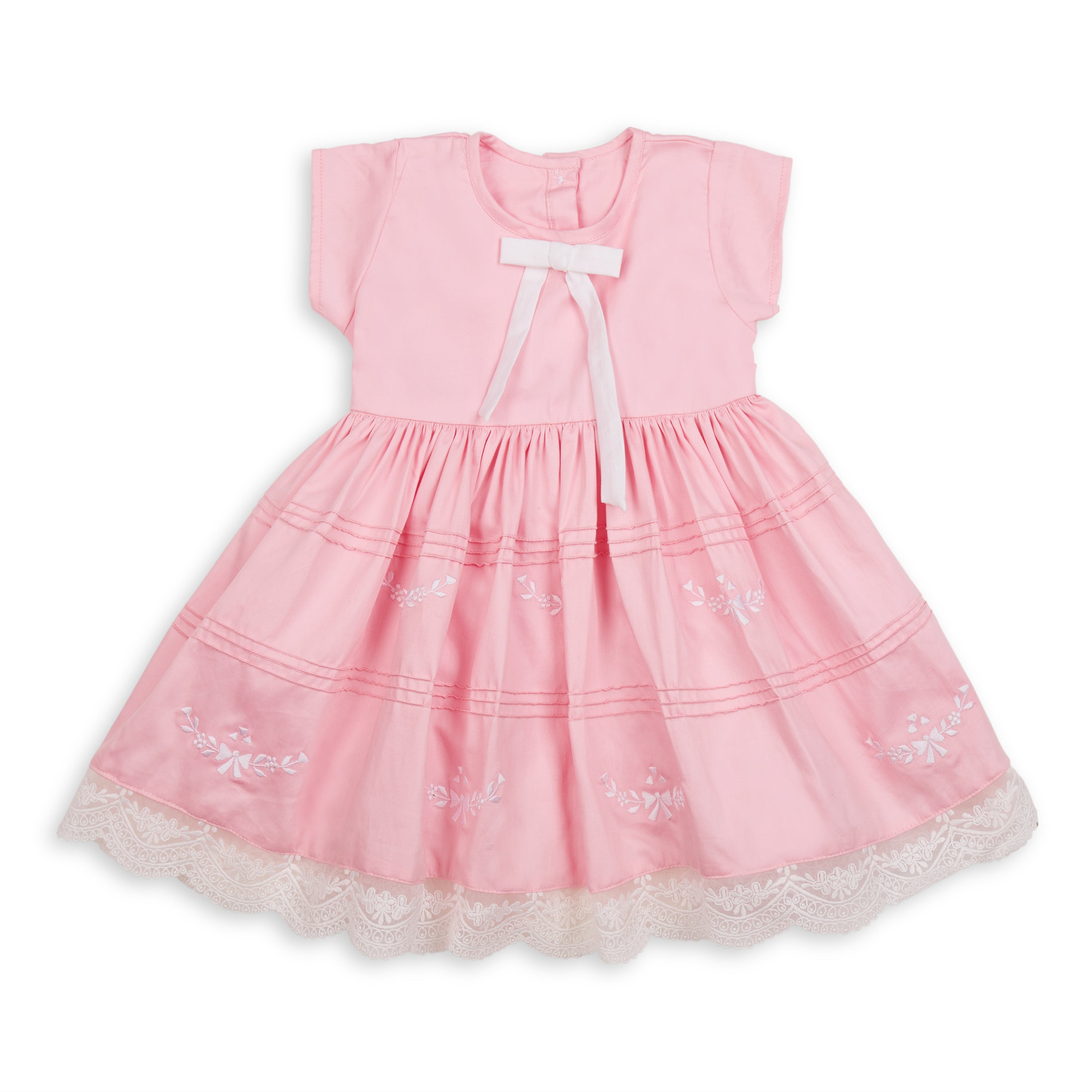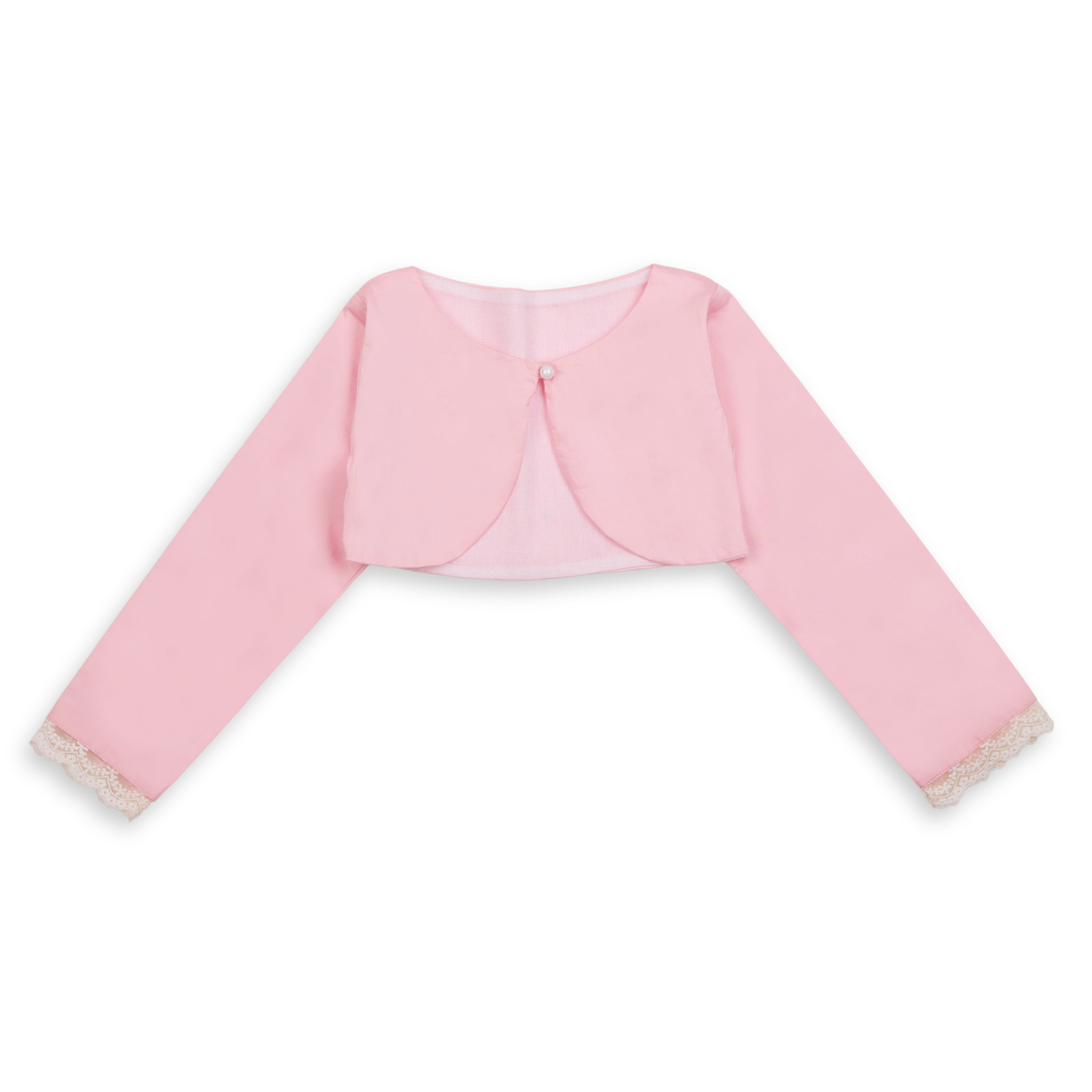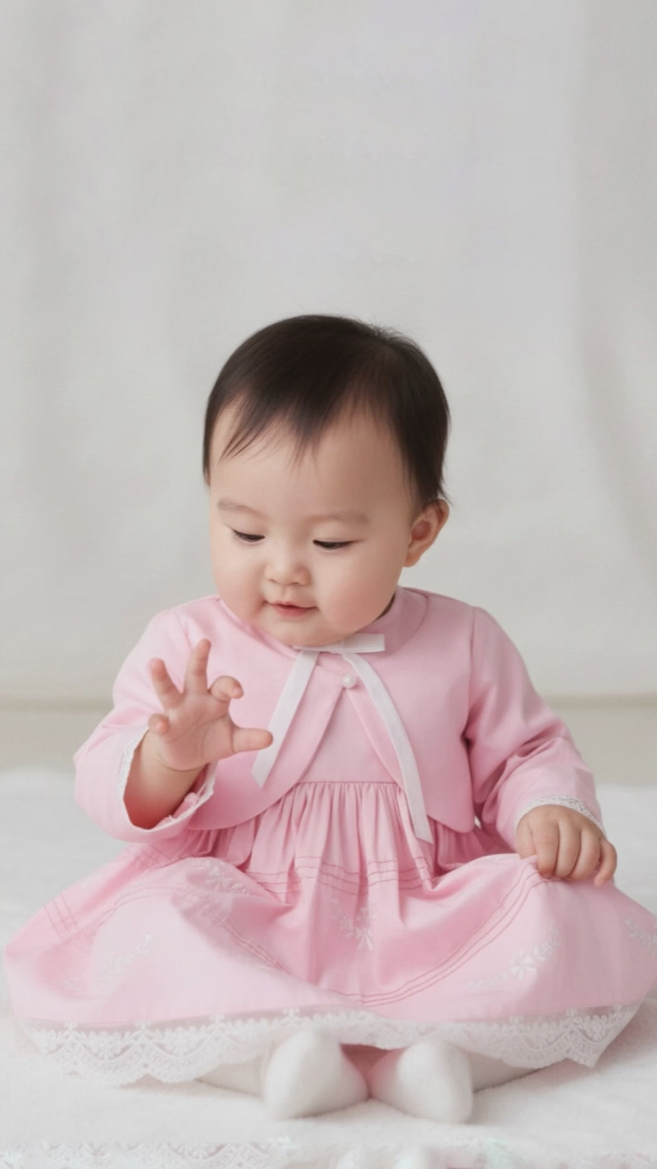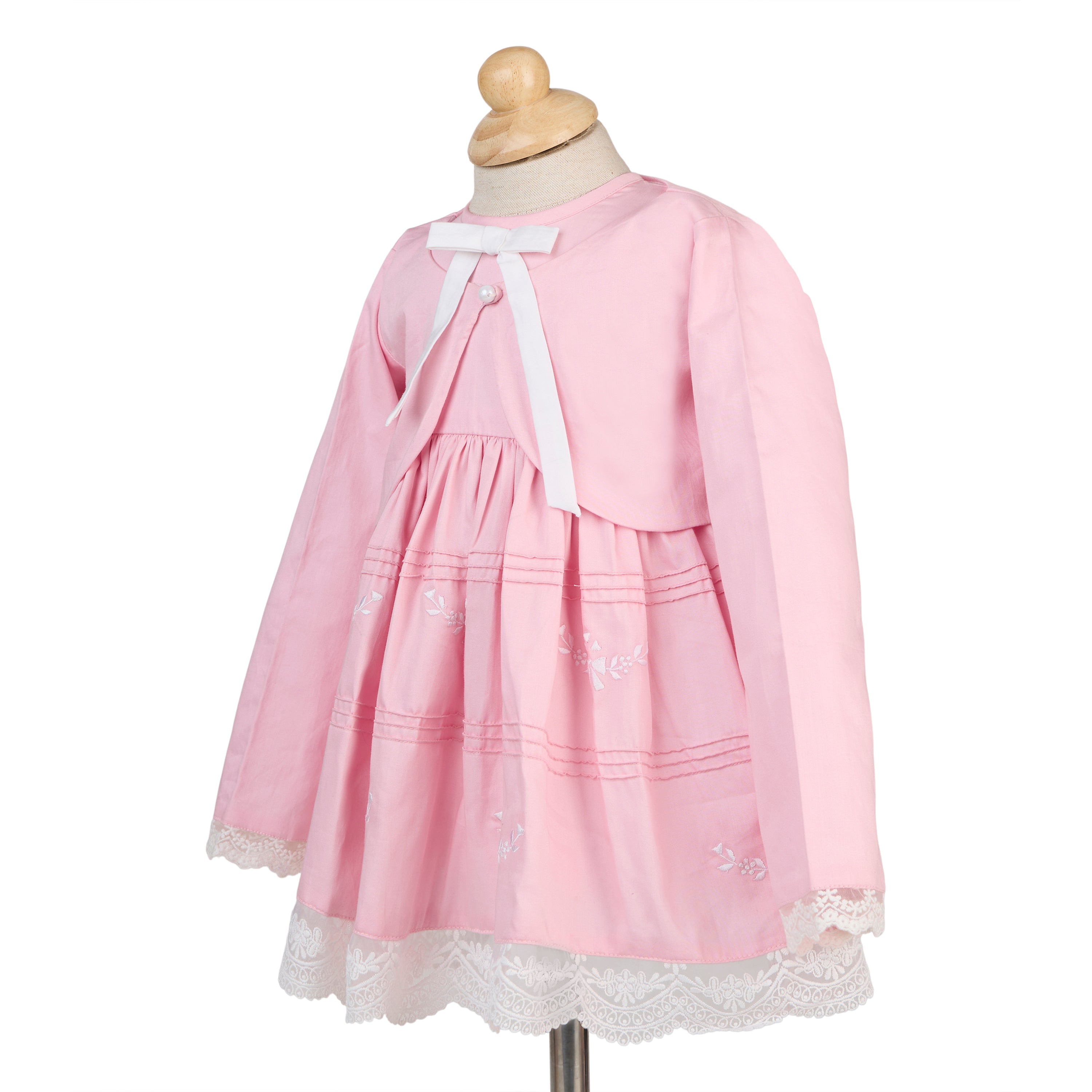 A whisper-soft rose for her biggest little moments. This occasionwear set features a long-sleeve baby dress with a coordinating bolero jacket, finished with fine pintucks and delicate tonal embroidery. Scalloped lace trims the cuffs and hem for an heirloom touch, while the matching bow hairband and coordinating bloomer complete the picture-perfect look—ideal from ceremony to celebration.