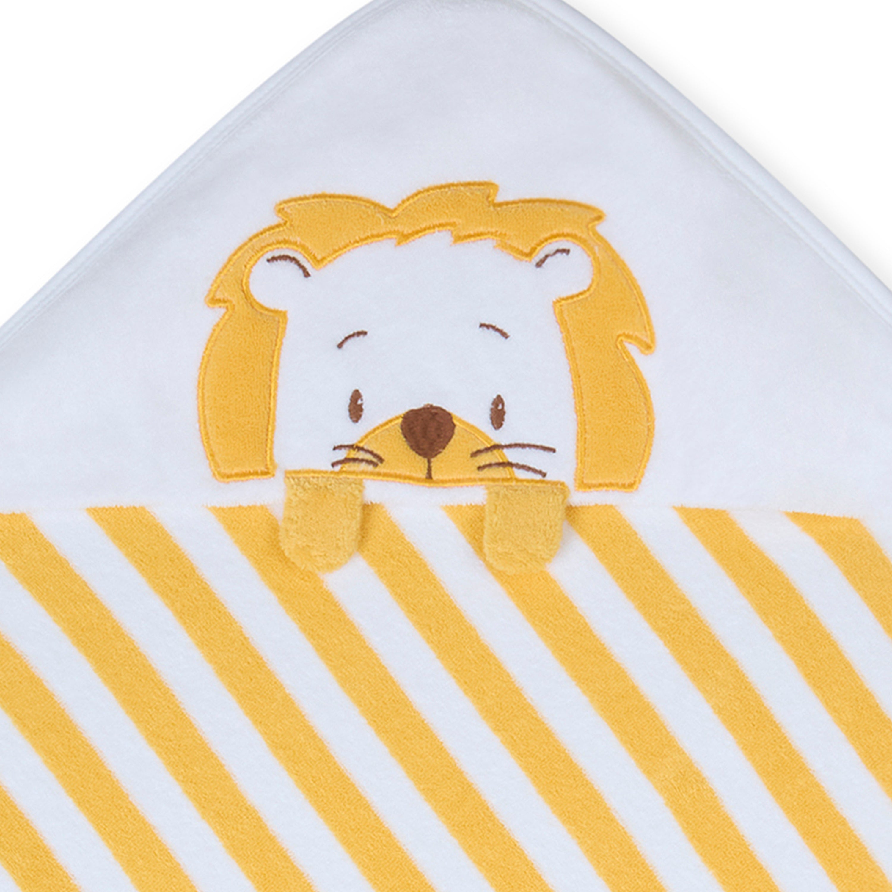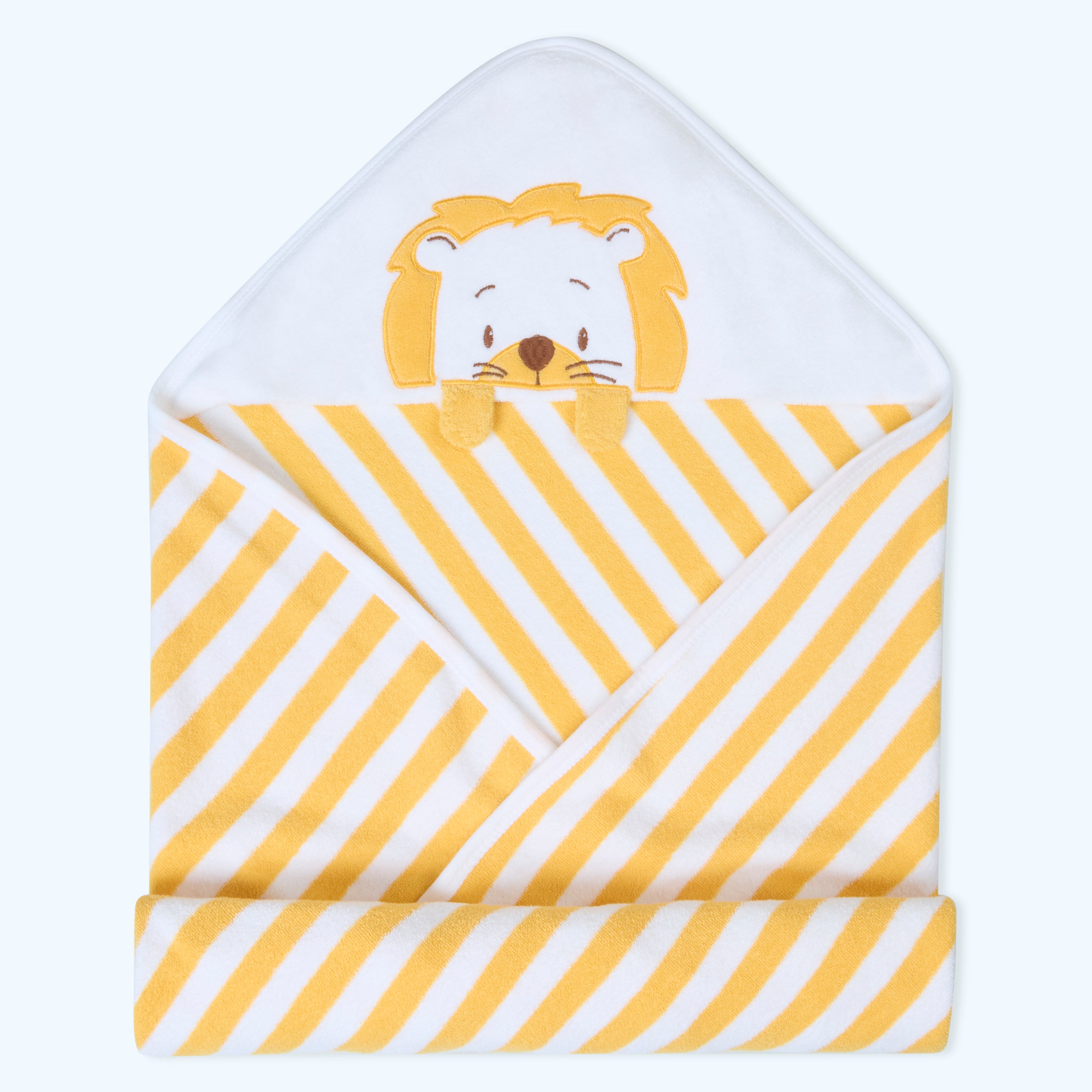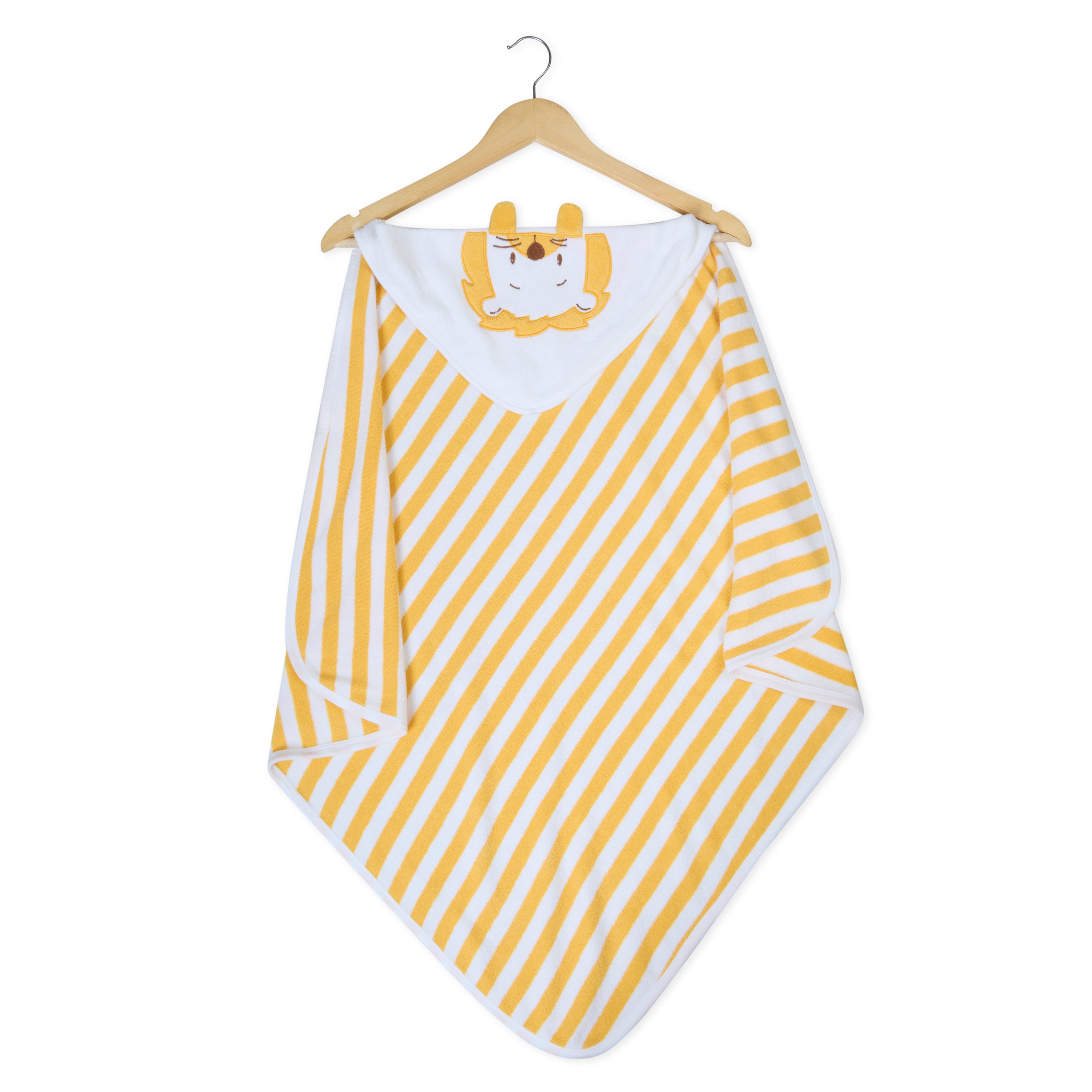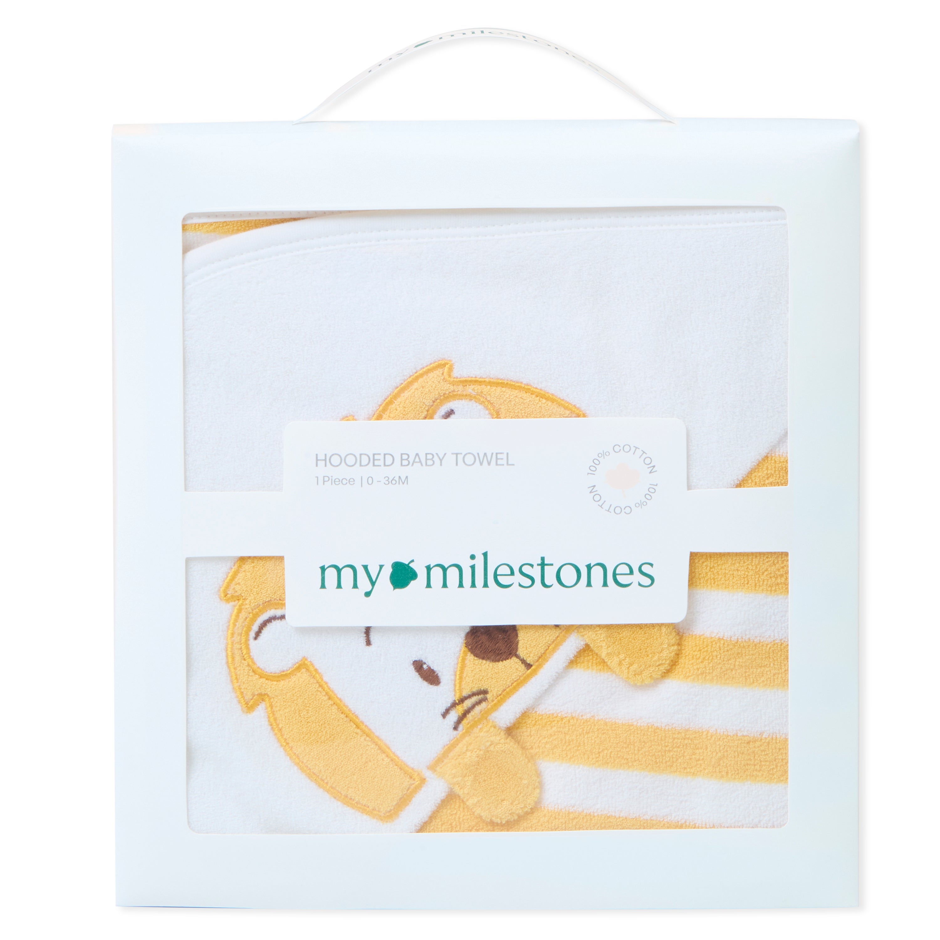 My Milestones 100% premium terry cotton towels are plush, super-soft and ultra-absorbent. These modern-stripped premium towels are made from 100% cotton yarn dyed terry fabric with generous size loop knitting for color fastness and higher absorption. Dual layered hood construction to keep your baby warm and snuggled after bath. Attractive color with matching applique embroidery. It has a loop to hang dry the towel.