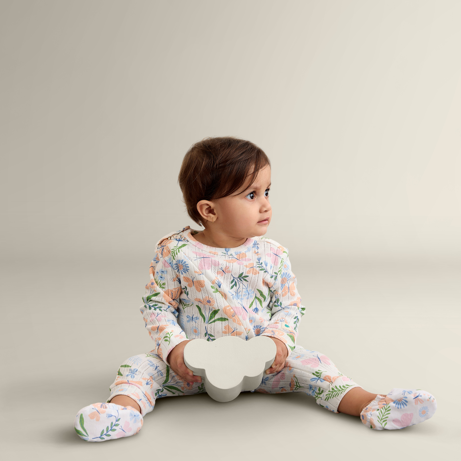 Our Enchanted Flora Pure Cotton Pointelle Knit 2-Way Zipper Romper is a soft, breathable baby romper made from pure cotton knit with a delicate pointelle pattern. It features a 2-way zipper for easy dressing and diaper changes, and likely has a charming floral design.