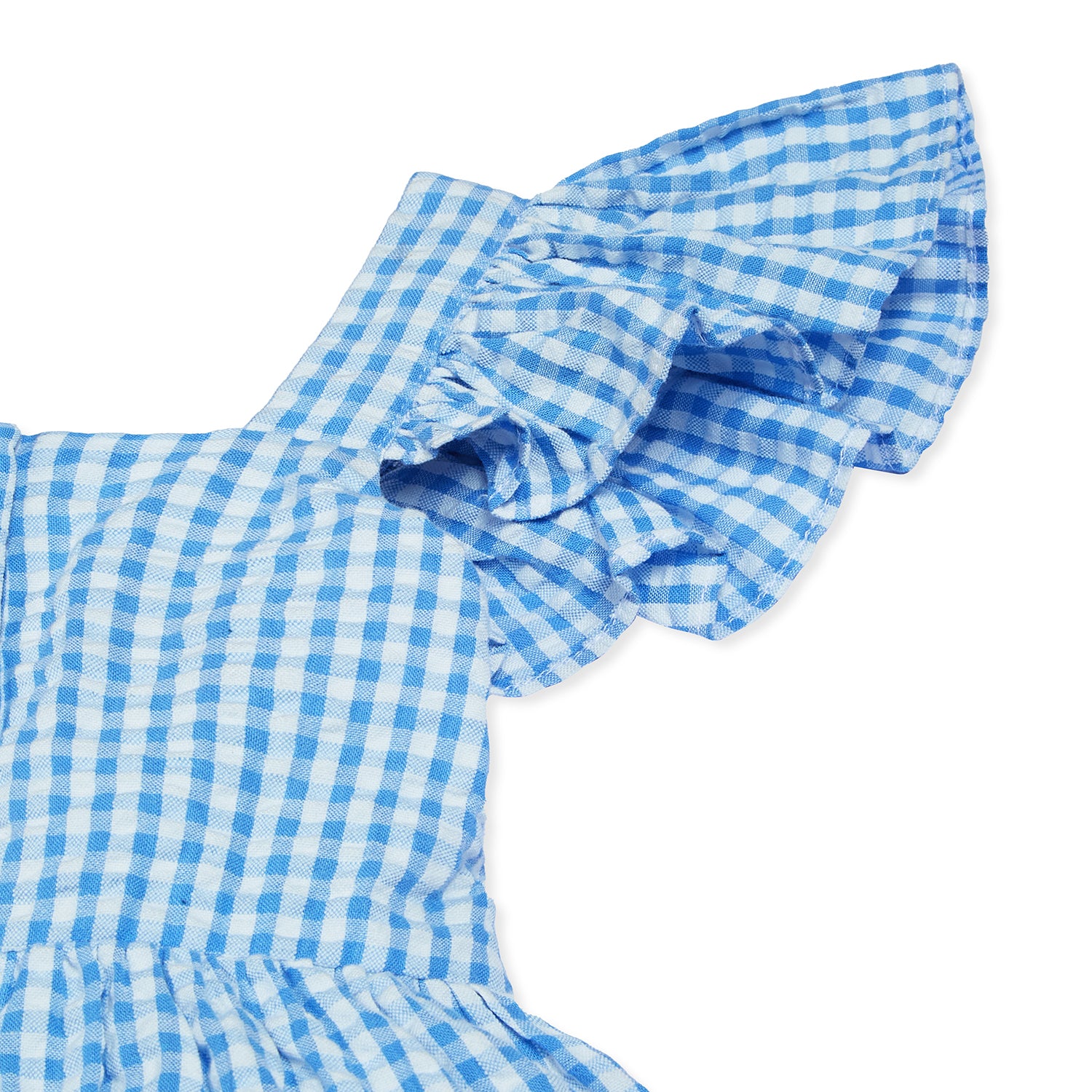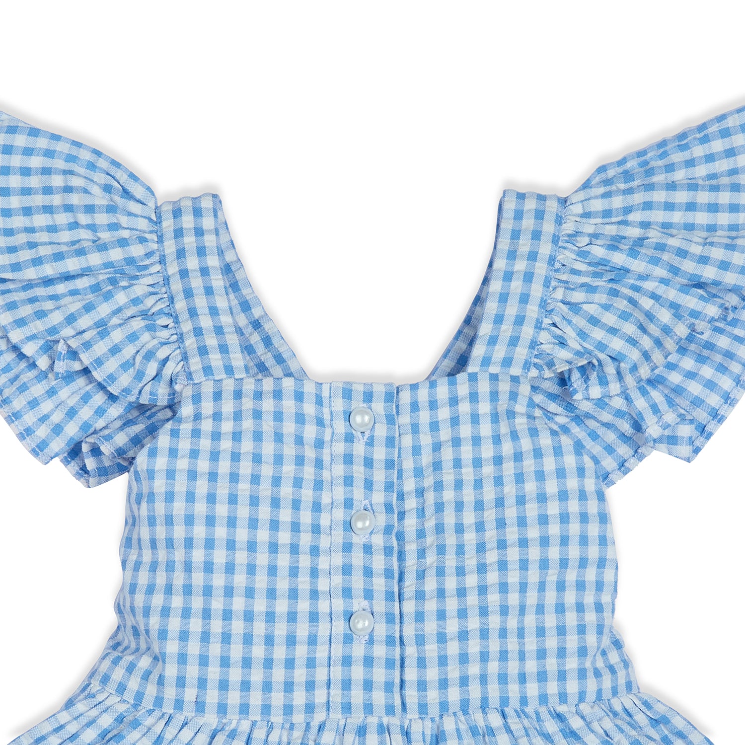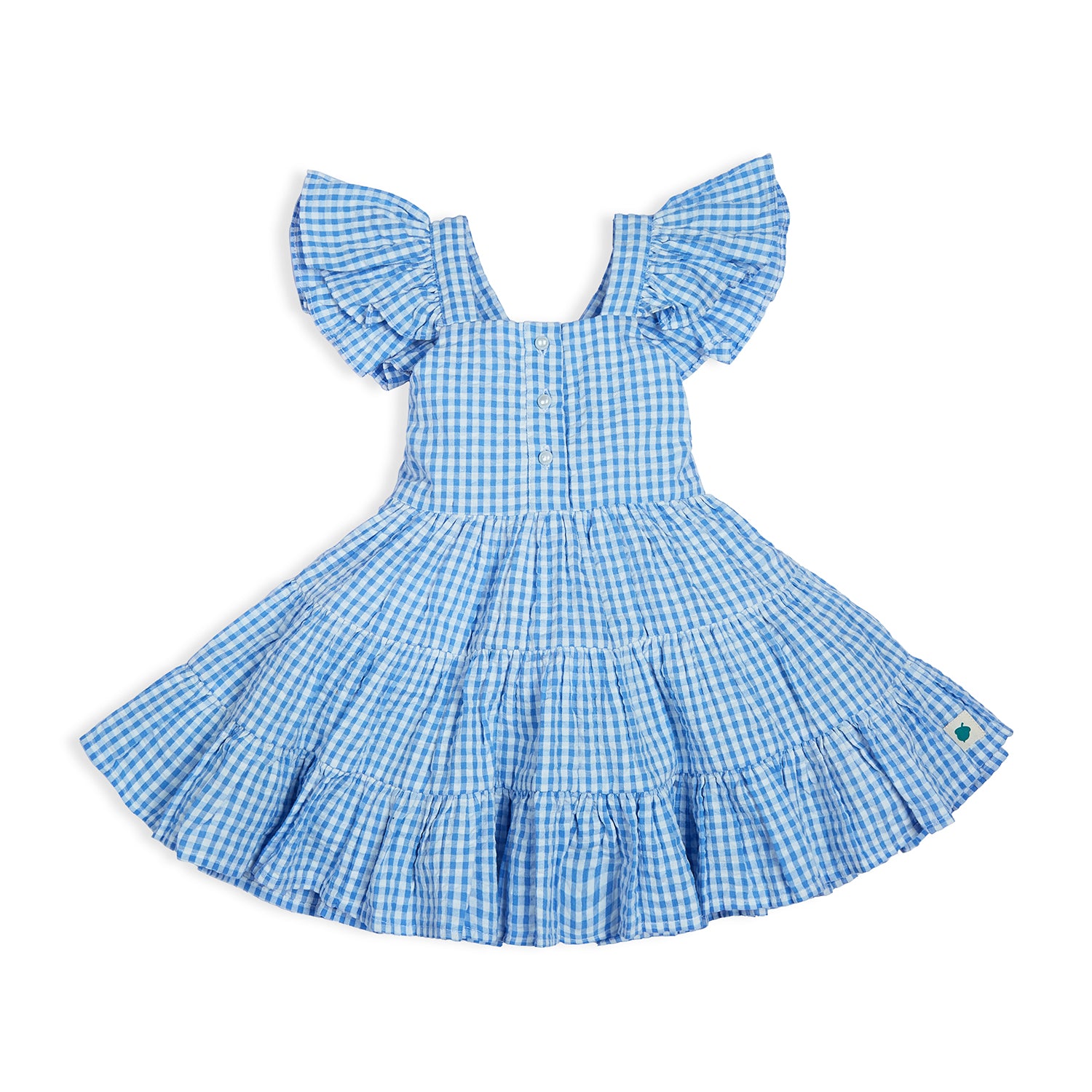 Our charming blue gingham tiered dress featuring ruffle short sleeves and pearl buttons for a touch of elegance. Perfect for warm days, offering both style and comfort.