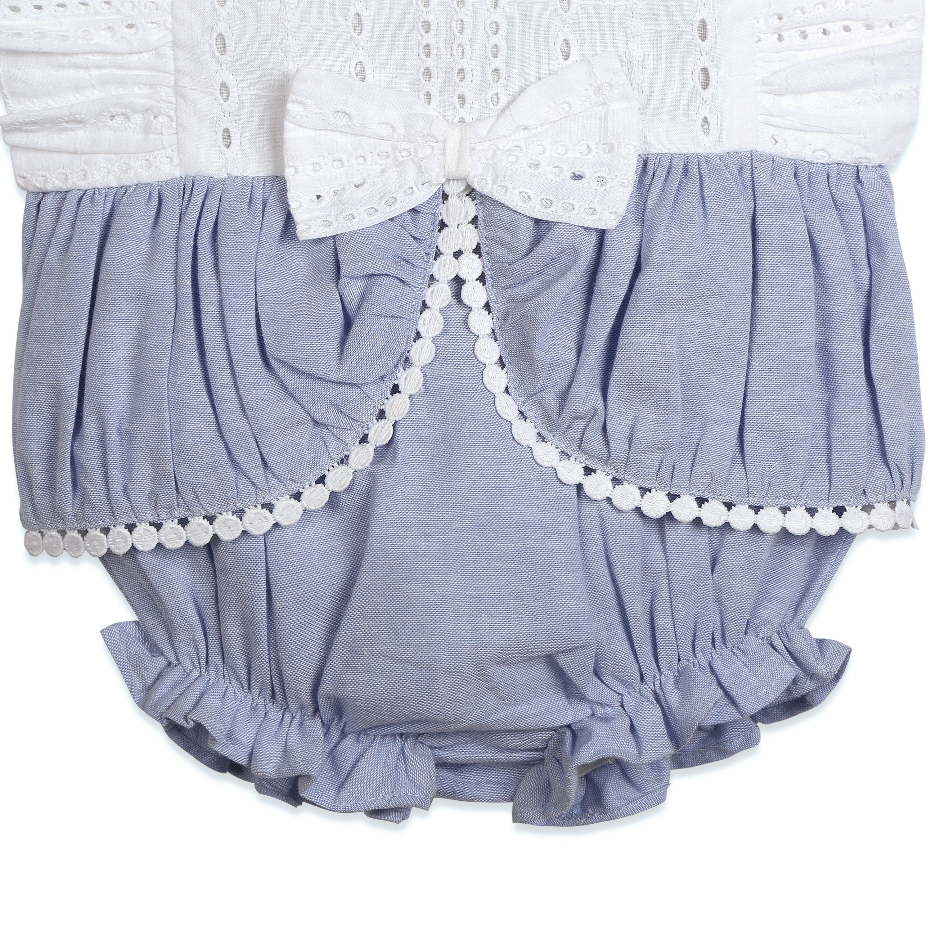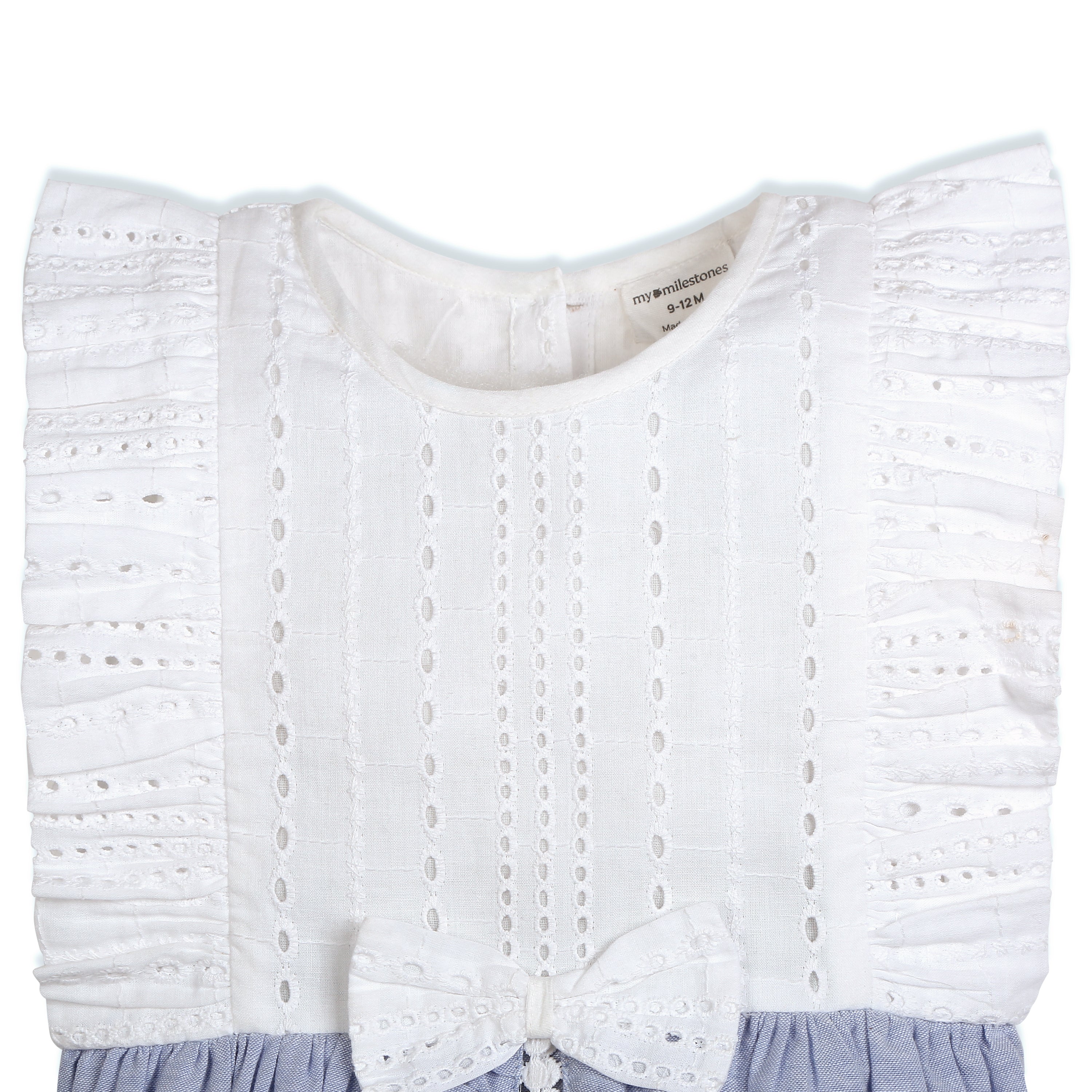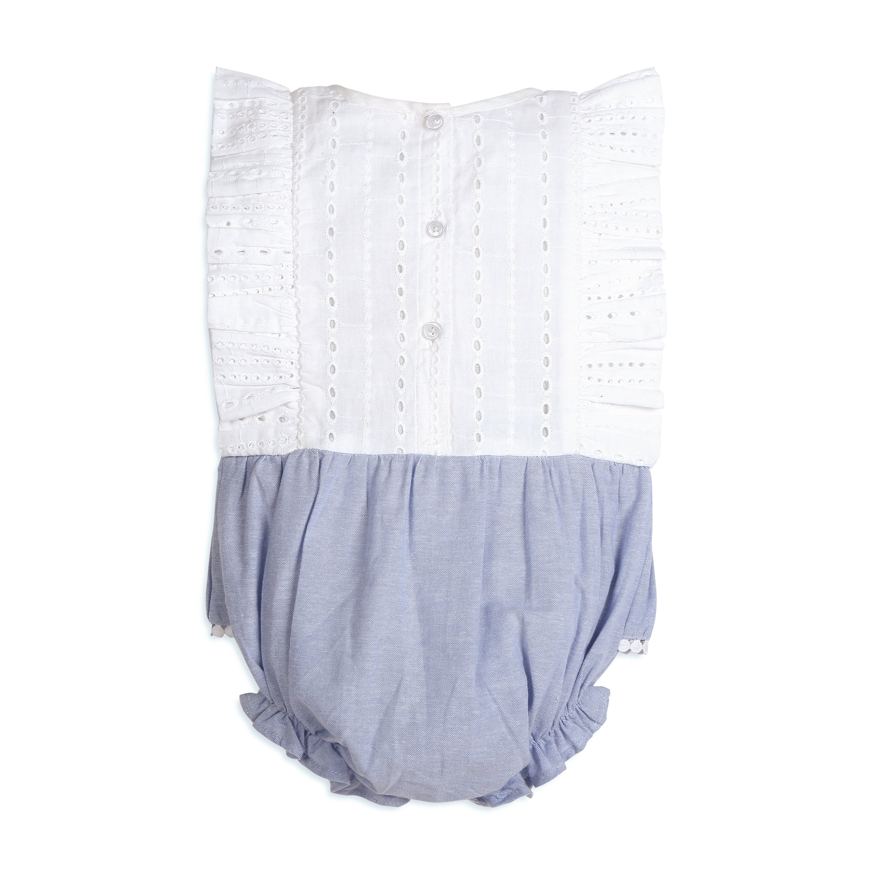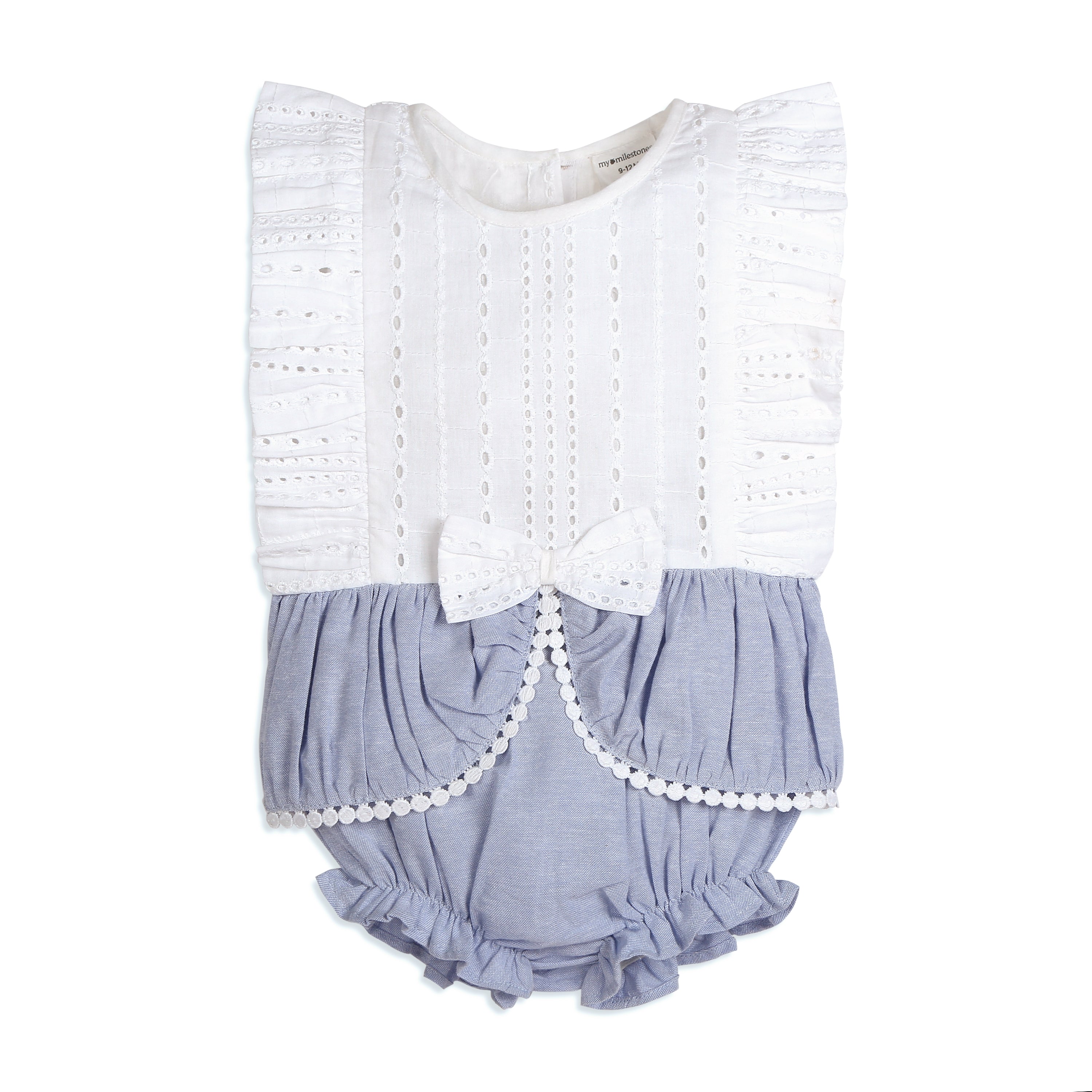 The Luna Sky Eyelet short romper in white & blue is a perfect blend of charm and comfort. Made from premium cotton eyelet fabric and 100% cotton Oxford chambray, this romper is soft and breathable for all-day wear.
