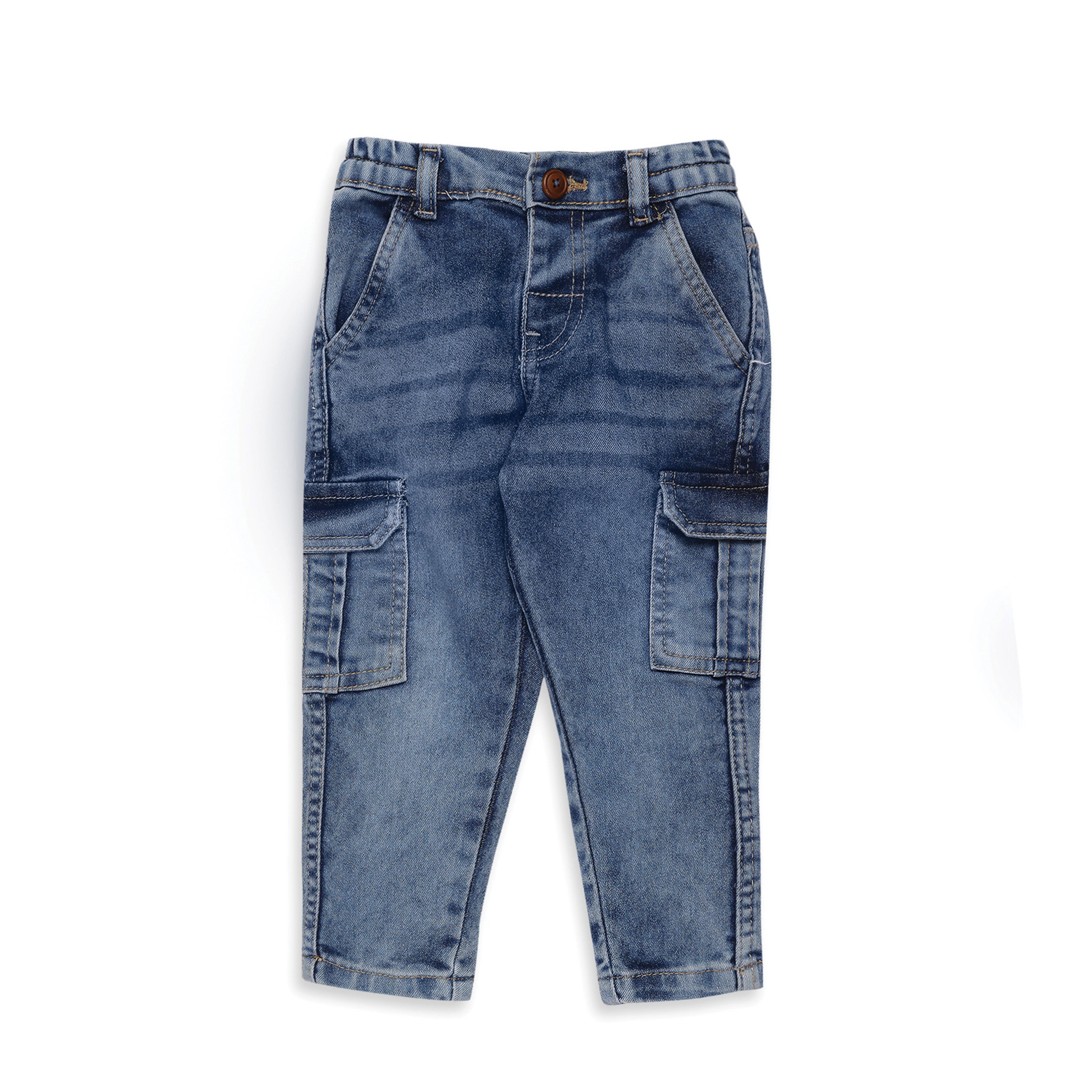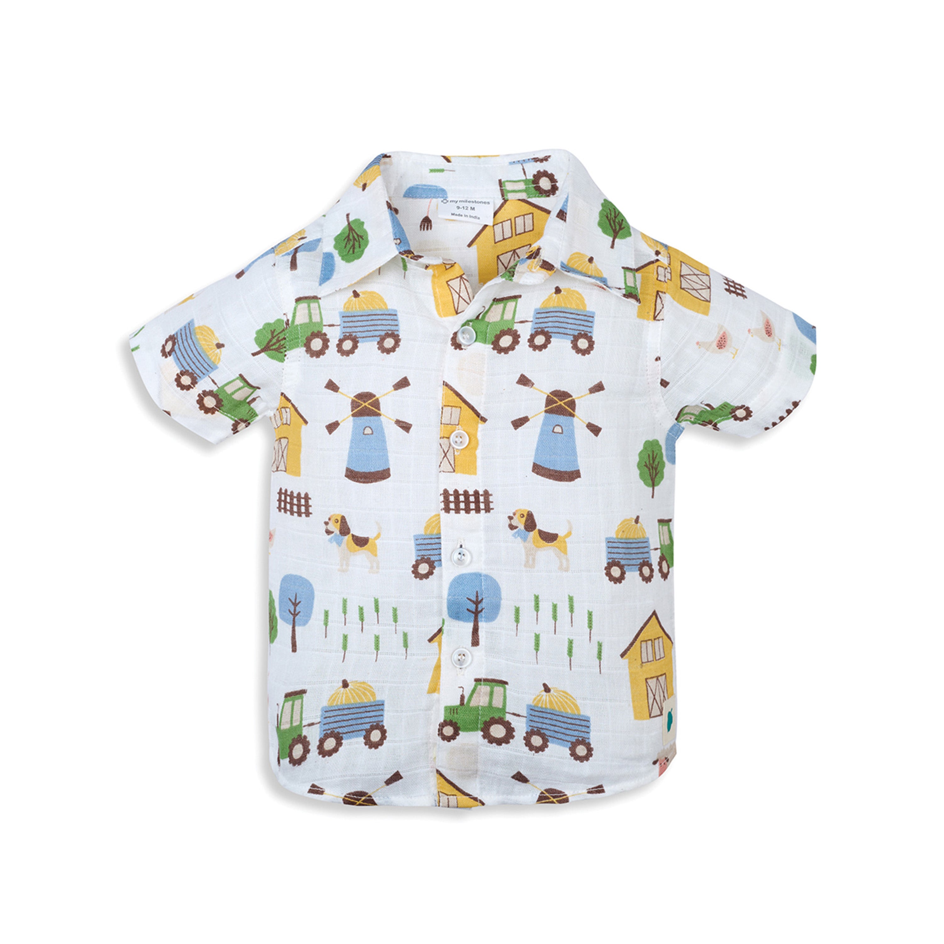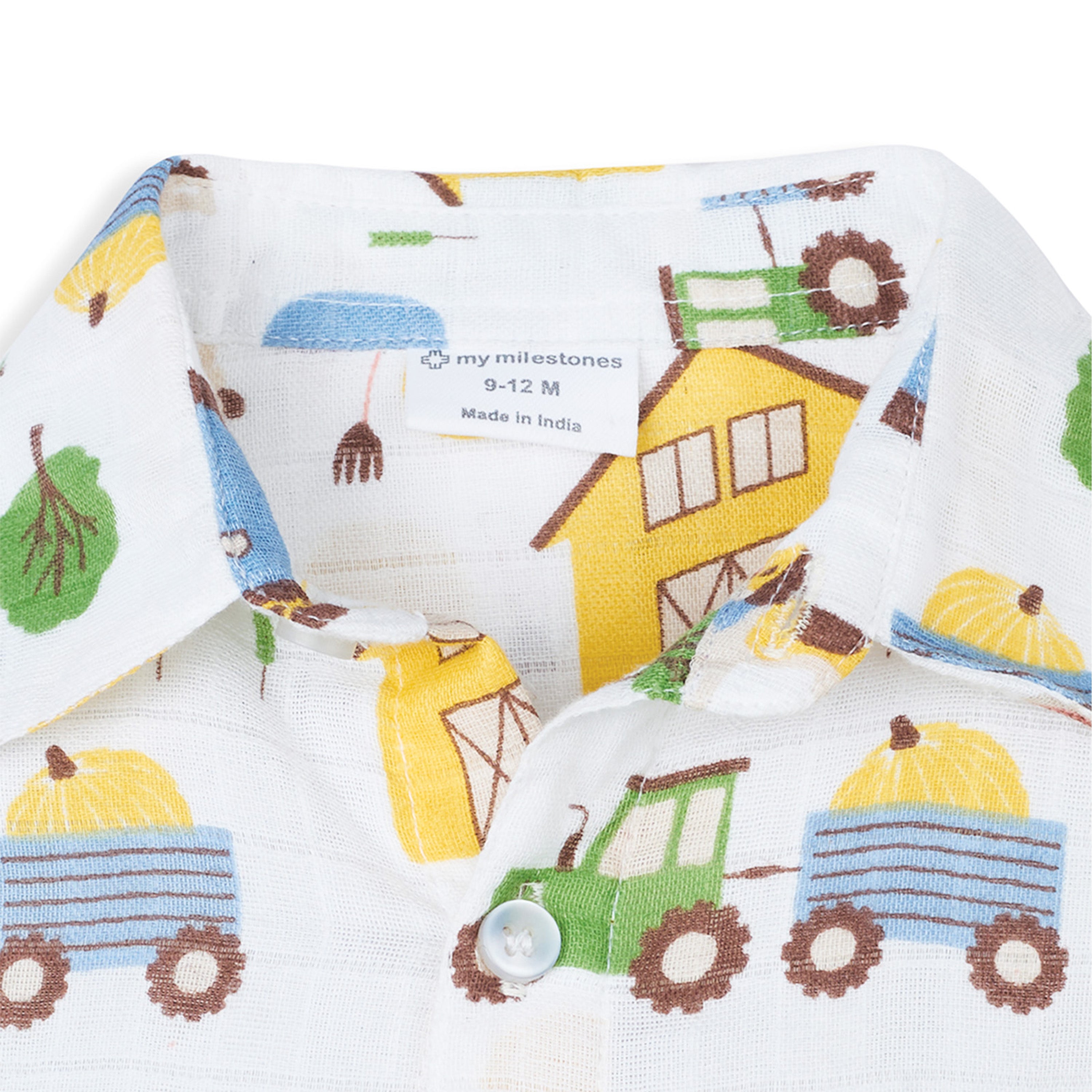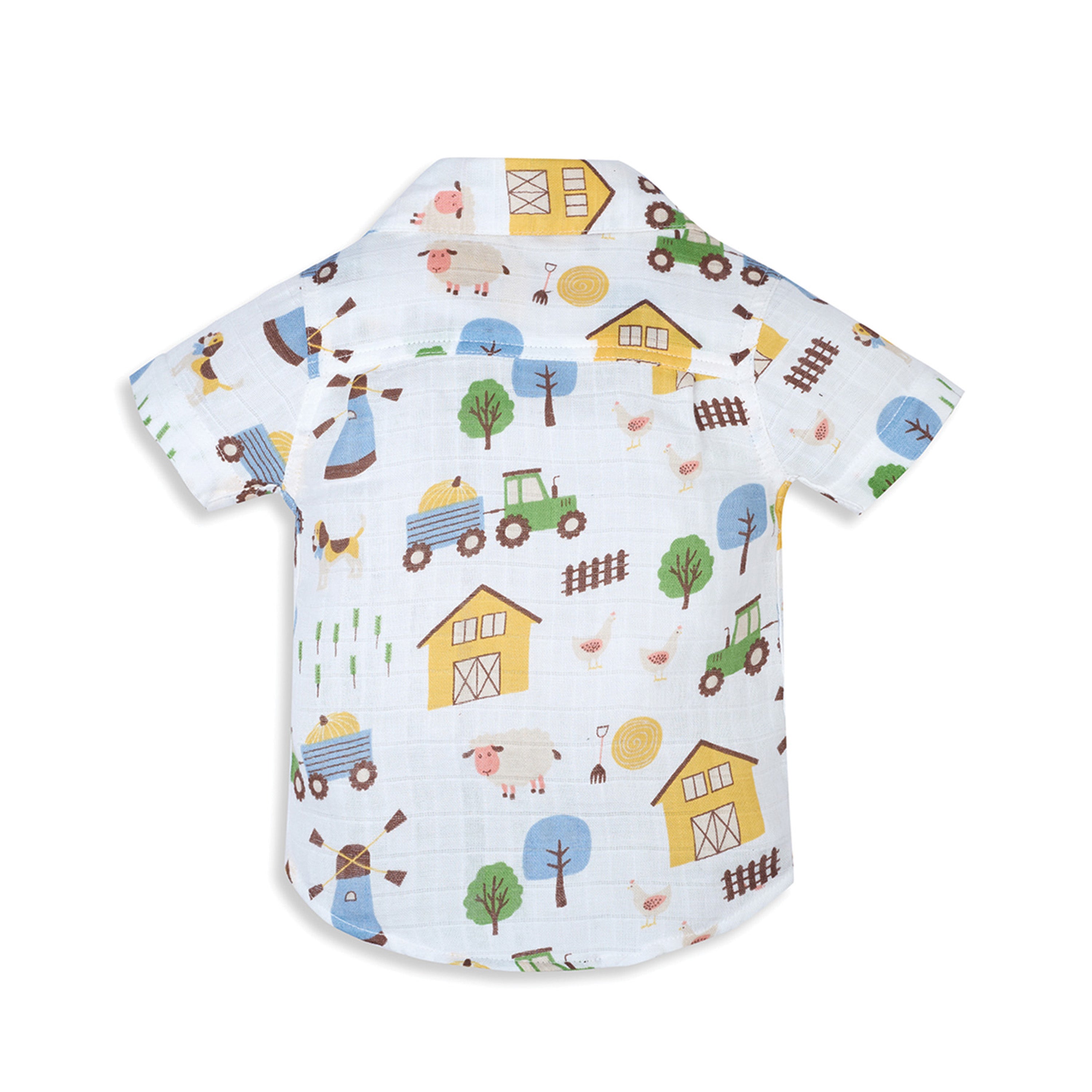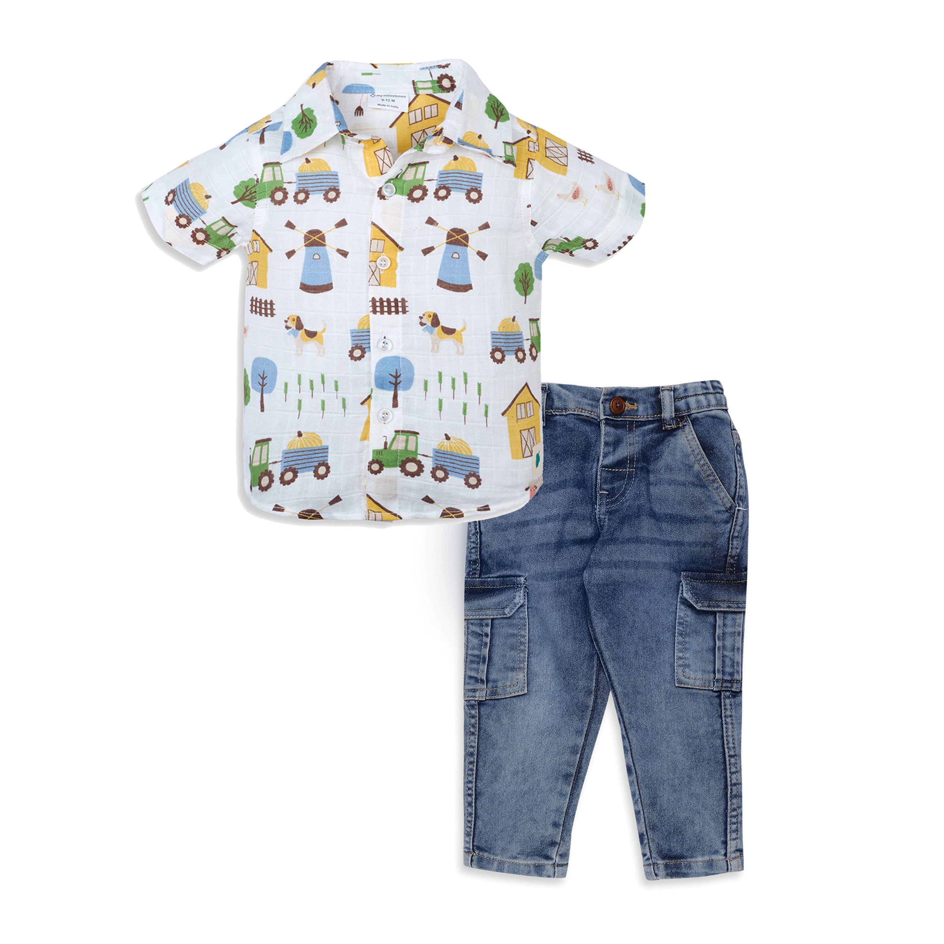 Short sleeves front open soft muslin shirt with barnyard printed and pure cotton denim jeans set.